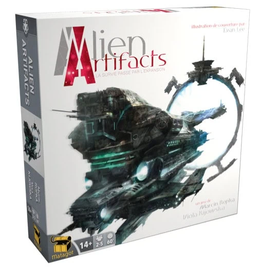 Accueil Jeux Alien Artefacts, développez votre Empire en mode 4X chez Matagot Alien Artefacts, développez votre Empire en mode 4X chez MatagotBenjamin Guimbert·JeuxCritique·27 juin 2018 à 09h33 Benjamin Guimbert Alien Artefacts est un jeu de Marcin Ropka et Viola Kijowska. Illustré par Evan Lee, Igor Puskaric, Aleksandar Mihajlovic, Pablo Fernandes, Bogdan Tufecciu, Miroslav Petrov, Rayper P, Jack Griffin et Rafal Szyma. De 2 à 5 joueurs, à partir de 14 ans, pour des parties de 60 minutes. Édité par Portal (Pologne) et pour la version française nous retrouvons Matagot aux manettes et Surfin’ Meeple à la distribution. Sorti en boutique juin 2018. Synopsis : Vous êtes à la tête d’une faction interstellaire parmi 6 disponibles : La Ligue, l’Union Stellaire, les Episcopaliens, les Bioniques, la Communauté et les Tribus Clones. Développez votre empire à l’aide de nouvelles technologies, partez à la découverte d’Artefacts Alien. Construisez votre flotte pour anéantir les forces aliens ennemies tout en explorant la galaxie pour découvrir de nouvelles technologies. Les Factions : Alien Artefacts est un jeu asymétrique 4X de 240 cartes: Chaque joueur choisit une faction (ou distribution au hasard) et reçoit le plateau de sa faction qui est double-face pour le côté homme/femme, ainsi que les jetons en bois de la couleur correspondante et sa carte faction. Cette dernière indique votre mise en place de départ avant le début de votre tour de jeu. Un des jetons en bois sera placé sur 8 Crédit galactique (C), la partie Banque en bas de la fiche et le 2nd jeton sera placé sur le début de la piste de score de la fiche correspondante. Chaque joueur reçoit 3 cartes Ressource piochées au hasard dans le paquet Ressource. Concernant la mise en place de la zone de jeu, mélangez séparément chacun des paquets puis placez le paquet de cartes Ressource face cachée au centre. Les paquets de cartes Vaisseau, Technologie et Planète sont placés respectivement à gauche du paquet Ressource, face Logistique visible. Au dessus, le paquet de cartes Système Alien est placé face cachée. La 1ère carte est révélée puis placée à côté face visible. De façon visible et accessible, placez le paquet de cartes Artefact Alien, le paquet Plans de défense et les jetons Blocus. Qui dit asymétrique dit factions aux capacités différentes les unes des autres. Une 1ère pour l’obtention d’un Artefact Alien pendant le cours de la partie et une 2nde en fin de partie pour gagner de précieux points de Victoire. En fonction du nombre de joueurs, vous effectuerez un certain nombre de tours. Le joueur ayant le plus grand nombre de points de victoire remporta la partie. Pour ce faire vous devez produire des Ressources, utiliser des Technologies et attaquer des Systèmes Aliens avec vos Vaisseaux. Lorsque le paquet de cartes Ressource est vide, Le tour de jeu prend fin: avancez le marqueur tour vers la droite, mélangez la défausse de cartes Ressource pour créer une nouvelle pioche. Les cartes Ressource : Elles sont divisées en 2 sections, la partie haute et la partie basse de la carte. Chaque section comporte entre 1 et 3 symboles d’une ressource en particulier : en bleu la Recherche, en vert la Découverte, en rouge l’Armée et en dorée la Richesse, ressource universelle qui remplace n’importe qu’elle autre Ressource. Exemple d’une carte Ressource (Cf. photo ci-dessous). Section du haut 3 ressources Découvertes & section du bas 2 ressources Dorées. Le chiffre placé au centre (entre 1 et 4) des cartes Ressource vous servira lors des Attaques/Défenses. Il existe 4 types de Technologies, 4 types de Planètes et 4 types de Vaisseaux, le tout en mode 4x. La face logistique vous apporte un bonus permanent particulier en fonction du type de cartes et la face opérationnelle apporte des cartes pour les Planètes – des points de victoire pour la Technologie en remplissant 1 objectif – 1 capacité d’attaque lors des combats. Tour de jeu : 1. Phase d’Action Effectuez 1 action parmi 7 actions de base disponibles en dépensant 2 cartes Ressource maximum: Acheter une carte Dépensez 5 crédits puis piochez la 1ère carte d’un des paquets suivants : Vaisseaux, Technologie ou Planètes et placez la dans la zone construction (à gauche de votre plateau faction). Pour chaque crédit supplémentaire dépensé, piochez une carte de plus du paquet. Vous n’en gardez qu’une alors faites le bon choix. Découvrir une Planète Dépensez 5 ressources Découverte (vertes) pour passer une carte Planète en construction (côté gauche de votre plateau) vers votre Empire (côté droit). Vous choisirez soit la face Logistique, soit la face Opérationnelle. Le coût en Ressource augmente de 1 pour toute Planète déjà présente dans votre Empire. Il est possible que la carte Planète produise des Ressources en piochant des cartes Ressource : marquez des points de victoire si le type de la section correspond à votre type de Planète. Développer une Technologie Dépensez 5 Ressources Recherche (bleues) pour passer une carte Technologie en construction (côté gauche de votre plateau) vers votre Empire (côté droit). Vous choisirez soit la face Logistique, soit la face Opérationnelle. Le coût en Ressource augmente de 1 pour toute Technologie déjà présente dans votre Empire. Selon que vous choisissez la face Logistique ou Opérationnelle vous aurez droit respectivement soit à un bonus permanent soit à des points de victoire. Construire un Vaisseau Dépensez 5 Ressources Militaire (rouges) pour passer une carte Technologie en construction (côté gauche de votre plateau) vers votre Empire (côté droit). Vous choisirez soit la face Logistique, soit la face Opérationnelle. Le coût en Ressource augmente de 1 pour tout Vaisseau déjà présent dans votre Empire. Selon que vous choisissez la face Logistique ou Opérationnelle vous aurez droit respectivement soit à un bonu