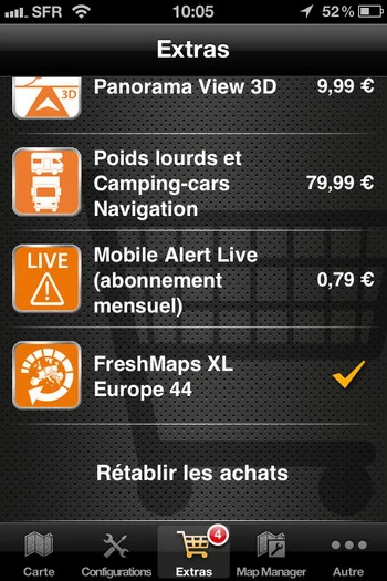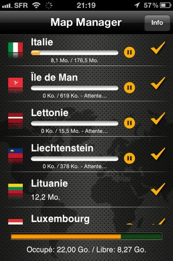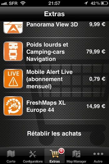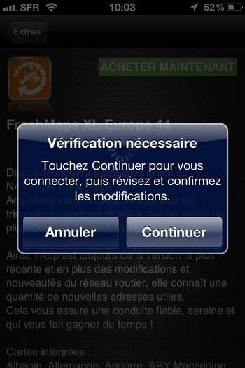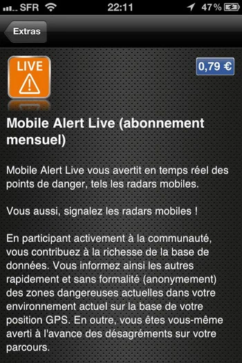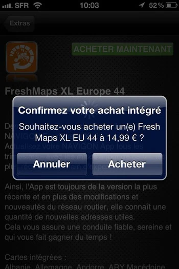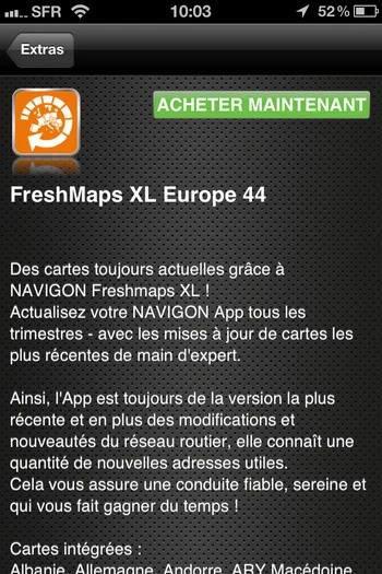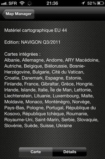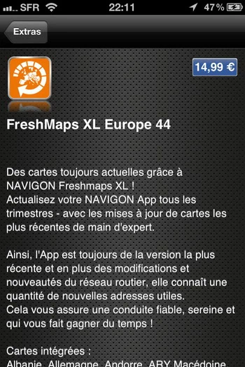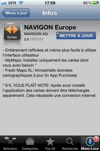 Accueil Critique Navigon 2.0 sur iphone en détail Navigon 2.0 sur iphone en détailzast·CritiqueGeekLogicielVoitureVoyage·17 novembre 2011 à 22h28 zast C’est aujourd’hui que la version 2.0 de Navigon sur iphone vient de sortir. J’utilise ce logiciel sur iphone depuis très longtemps et je n’ai jamais été trop déçu sauf sur l’actualisation des cartes et des radars routiers. Maintenant, Navigon 2.0 devrait corriger ces défauts si vous payez en achat in-app … Je vous propose de découvrir les nouveaux menus et des informations sur cette nouvelle version. Ce n’est pas vraiment un test ni une review de Navigon 2.0 sur iphone mais plutôt toutes les informations via des captures d’écrans de mon iphone 4s. Tout d’abord voici une information importante sur NAVIGON FreshMaps XL : Navigon via sa page facebook confirme que : NAVIGON FreshMaps XL is a life time product with a one time payment donc NAVIGON FreshMaps XL est bien un achat unique pour une mise à jour à vie ! C’est donc une très bonne nouvelle ! Plus bas dans l’article je vous montrerai la procédure d’achat. Pour Mobile Alert Live (0.79 euros/mois) qui permet d’alerter sur les radars, il faut faire attention car c’est une version béta comme Navigon le souligne !!! Attention, lors de votre première mise à jour du logiciel vous perdez vos destinations enregistrées (vos favoris). Il faut quitter l’application et la relancer pour les récupérer. Voici la liste des nouveautés : – Interface utilisateur refaite – MyMaps : Permet d’installer les cartes dont on a besoin – Fresh Maps XL : Achat des données cartographiques. Cela vous permettra d’avoir des cartes mises à jour Attention Navigon propose durant la période du 17 au 30 novembre 2011 l’option Fresh Maps XL à 14.99€ au lieu de 29.99€. La version europe de Navigon 2.0 sur Iphone est proposé aussi durant la même période à un prix réduit de 59.99 € au lieu de 89.99€. Je devrai en principe tester dès demain cette nouvelle mise à jour sur la route. Avis rapide sur navigon 2.0 iphone : Je l’ai testé le nouveau Navigon 2. Les cartes sont bien à jour et maintenant par exemple il s’aperçoit bien que la vitesse dans mon village est limitée à 30 km/h. Je l’ai utilisé sur l’autoroute, en ville et dans des petits villages et pour l’instant je l’ai trouvé fiable. Je vous propose de découvrir les différents menus. Voici la sélection des cartes via MyMaps : Et comme vous pouvez le voir je suis en train de télécharger toutes les cartes (par exemple Italie) Voici les pays : Et des informations sur la version : L’installation est finie et vous pouvez démarrer l’application Voici l’interface (le menu) mais je vous conseille de quitter l’application (la killer) puis la relancer :Voir aussi85%Benjamin GuimbertCritiqueJeux 10 septembre 2025 à 09h29Test et avis de Rollword Les configurations : La détection de radar est désactivée par défaut !! Les achats in-app Détail du mobile Alert Live : Freshmaps XL : NAVIGON FreshMaps XL lors d’un achat : Enfin les cartes 🙂
