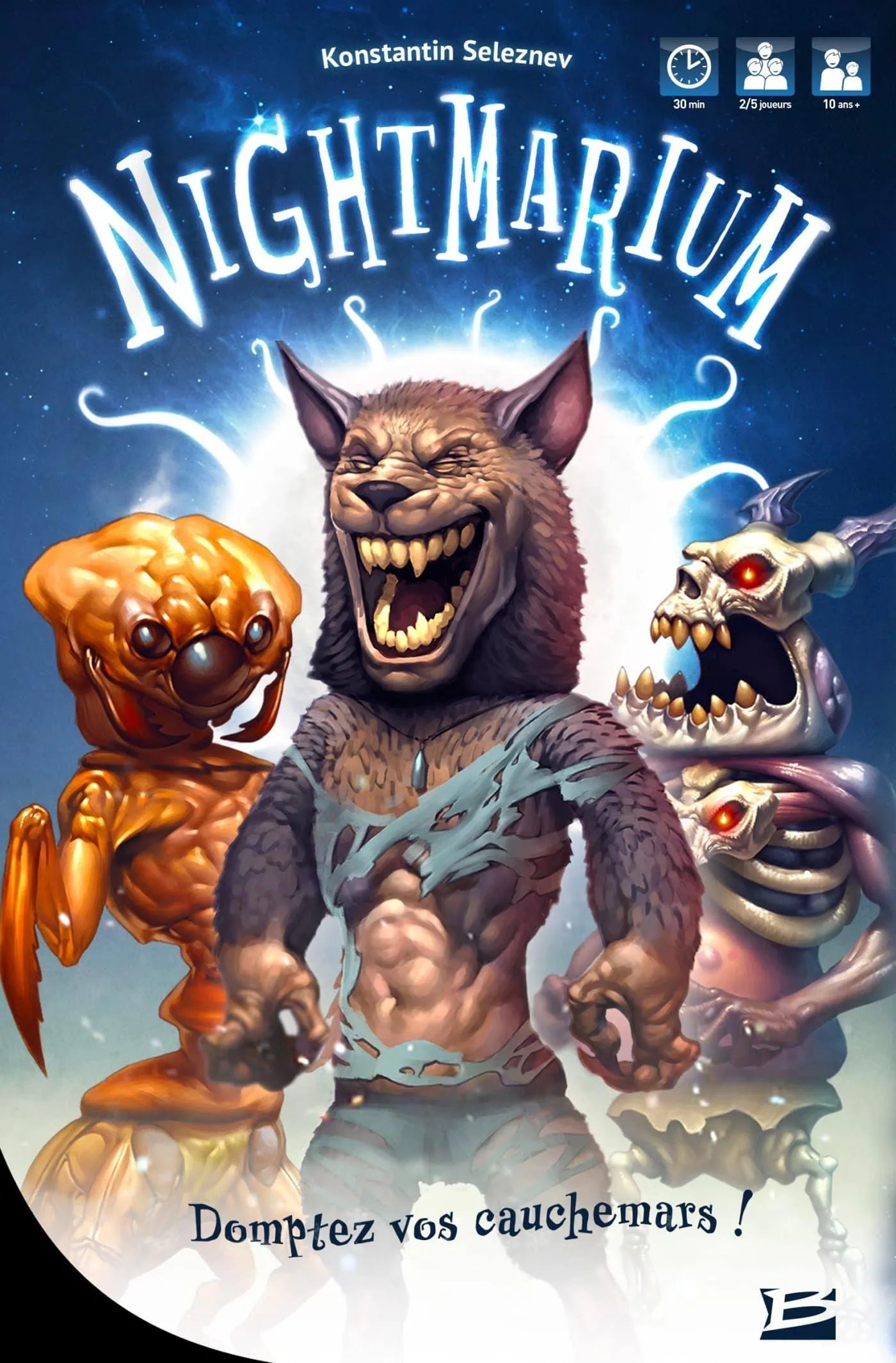 Accueil Jeux Nightmarium, entrez dans vos pires cauchemars chez Bragelonne Nightmarium, entrez dans vos pires cauchemars chez BragelonneWolverine·JeuxCritique·5 novembre 2018 à 18h50 Wolverine Nightmarium, en plain cauchemars… Nightmarium est un jeu de Konstantin Seleznev et illustré par Erbol Bulentaev. L’éditeur en France est Bragelonne. Il s’agit d’un jeu pour 2 à 5 joueurs à partir de 12 ans. Les parties sont extrêmement rapides car elles ne durent qu’une vingtaine de minutes. Il s’agit donc d’un jeu familial, même si les personnages rencontrés dans Nightmarium sont issus de nos cauchemars. Chaque joueur incarne un savant qui va devoir recréer 5 créatures plus étranges les unes que les autres. Il faudra pour cela réunir jambes, torse et tête afin d’en former une. Répétez l’opération 5 fois et vous avez gagné! Simple me direz-vous ? Pas si facile bien au contraire. Chacune de ces charmante bébêtes va avoir des pouvoirs qui vont être activé lors de la dernière phase de leur création. Et ces derniers peuvent être très féroces et destructeurs pour les adversaires! De plus, en calculant bien, on peut faire des combos dévastateurs! Ainsi, en passe de gagner la partie, on peut rapidement se retrouver dernier. La guerre des monstres va être terrible! Du coté de la rejouabilité, elle est incroyable. Chaque créature est composée de 3 parties. Les membres inférieurs, le tronc et la tête. Il existe 4 types de monstres, représentés par différentes couleurs et sachant que l’on peut tous les mélanger, imaginez le nombre de possibilités offertes! Et si vous êtes réellement chanceux, vous arriverez peut être à en faire un avec une seule et même couleur… Verdict : Nightmarium est un jeu de réflexion et de stratégie comme il en existe peu. Il va falloir bien calculer et avoir tout de même un peu de chance avec le tirage des cartes pour pouvoir remporter la partie. Un jeu qui séduira toute la famille, tant par la durée de ses parties que par des visuels et des créatures trop « mignonnes » pour être des monstres. Ou alors, des gentils monstres. On aime et on en redemande, voilà le genre de jeu agréable pour passer de bonnes soirées 🙂 Un grand merci à Bragelonne pour nous permettre de le découvrir en France!