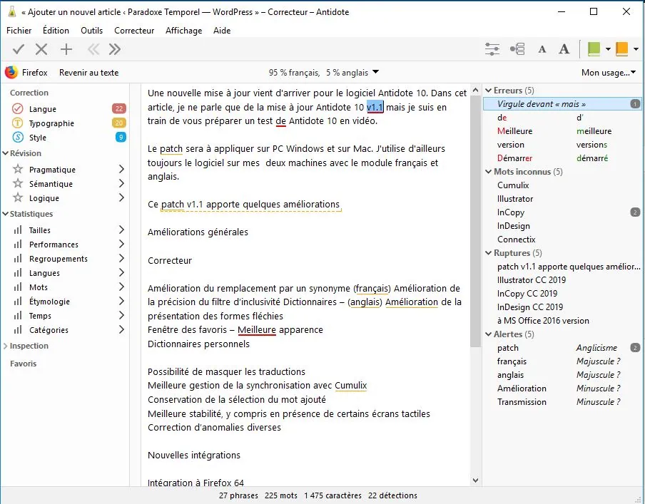 Accueil Logiciel Antidote 10 v1.1 Antidote 10 v1.1zast·Logiciel·15 décembre 2018 à 16h42 zast Une nouvelle mise à jour vient d’arriver pour le logiciel Antidote 10. Dans cet article, je ne parle que de la mise à jour Antidote 10 v1.1 mais je suis en train de vous préparer un test de Antidote 10 en vidéo. Pour rappel, Antidote est un correcteur orthographique et grammatical qui possèdent des dictionnaires et des guides linguistiques. On peut donc trouver des synonymes, antonymes, des citations, … Le patch sera à appliquer sur PC Windows, sur Mac et sur la version Linux. J’utilise d’ailleurs toujours le logiciel sur mon PC windows et sur mon Macbook pro avec le module français et anglais. Ce patch v1.1 apporte quelques améliorations Améliorations générales Correcteur Amélioration du remplacement par un synonyme (français) Amélioration de la précision du filtre d’inclusivité Dictionnaires – (anglais) Amélioration de la présentation des formes fléchies Fenêtre des favoris – Meilleure apparence Dictionnaires personnels Possibilité de masquer les traductions Meilleure gestion de la synchronisation avec Cumulix Conservation de la sélection du mot ajouté Meilleure stabilité, y compris en présence de certains écrans tactiles Correction d’anomalies diverses Voir aussizastLogiciel 23 septembre 2025 à 18h23Appsumo Bundle Volume 2 : AI Power Pack Nouvelles intégrations Intégration à Firefox 64 Intégration à Google Chrome 71 Intégration à Illustrator CC 2019 Intégration à InCopy CC 2019 Intégration à InDesign CC 2019 Intégration à MS Office 2019 (Excel, Outlook, PowerPoint, Word) Intégration à MS Office 2016 version 1811 (Excel, Outlook, PowerPoint, Word) Intégration à OpenOffice 4.1 Intégrations améliorées Anti-Oups! – Meilleur traitement de la liste d’exclusion selon le destinataire InCopy – Transmission du style (gras, italique) au correcteur (Windows 7) Ajout de Connectix dans le menu Démarrer [amazon_link asins=’2922010325,B07JGT7WGK’ template=’ProductCarousel’ store=’dvdalliance-21′ marketplace=’FR’ link_id=’21204f4a-0080-11e9-a655-f5e9345d239f’]