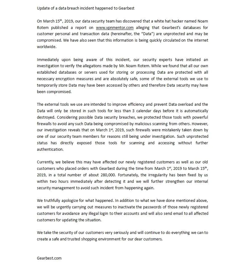 Accueil Actualite Gearbest problème de sécurité pendant 2 semaines Gearbest problème de sécurité pendant 2 semaineszast·ActualiteSecurité·17 mars 2019 à 16h38 zast Gearbest, le site d’achat dont nous parlons quelques fois a eu un gros problème de sécurité les semaines du 1er mars 2019 au 15 mars 2019. La société chinoise est souvent en contact avec différents gros sites internet d’actualité, et cela a pu vous toucher aussi. Suite à ce problème, nous avons décidé de vous informer sur ce problème. Voici le post sur Facebook de Gearbest en français avec notre traduction ainsi que la version originale en dessous. Vous trouverez aussi un lien vers le rapport complet de VPN Mentor en fin d’article. Problème Gearbest en français Mise à jour d’un incident d’atteinte à la protection des données survenu à Gearbest Le 15 mars 2019, l’équipe de sécurité de Gearbest a découvert qu’un pirate White hat nommé Noam Rotem a publié un article sur www.vpnmentor.com qui affirme que les bases de données personnelles et transactionnelles des clients (ci-après, les » Données « ) de Gearbest sont non protégées et peuvent être corrompues. Gearbest a également constaté que cette information a été rapidement diffusée sur Internet dans le monde entier.Dès qu’ils ont eu connaissance de cet incident, les experts en sécurité de Gearbest ont ouvert une enquête pour vérifier les allégations faites par M. Noarn Rotern. Bien que Gearbest ait constaté que les bases de données ou serveurs utilisés pour le stockage ou le traitement des données sont protégées par toutes les mesures de cryptage nécessaires et sont absolument sûres, certains des outils externes que Gearbest utilise pour stocker temporairement les données peuvent avoir été utilisés par d’autres et donc la sécurité des données peut avoir été compromise. Les outils externes que Gearbest utilise sont destinés à améliorer l’efficacité et à prévenir la surcharge de données et les données ne seront stockées dans ces outils que pendant moins de 3 jours avant d’être automatiquement détruites. Considérant d’éventuelles brèches dans la sécurité des données, Gearbest a protégé ces outils à l’aide de firewall puissants afin d’éviter que ces données ne soient compromises par d’autres personnes. Cependant, l’enquête de Gearbest révèle que le 1er mars 2019, l’un des membres de l’équipe de sécurité a stoppé ces firewalls par erreur pour des raisons qui sont encore en cours de recherche. Ce problème a directement exposé des données avec des accès sans autre authentification. Actuellement, Gearbest pense que ce problème a affecté les nouveaux clients ainsi que les anciens clients qui ont passé des commandes chez Gearbest au cours de la période allant du 1er mars 2019 au 15 mars 2019. Cela concerne un nombre total d’environ 280.000 commandes. Heureusement, le problème a été corrigé par Gearbest dans les deux heures qui ont suivi sa détection et Gearbest renforce encore la gestion interne de la sécurité pour éviter que de tels incidents ne se reproduisent. Gearbest s’excuse sincèrement pour ce qui s’est passé. En plus de ce que Gearbest a fait mentionner ci-dessus, ils prendront en urgence des mesures pour désactiver les mots de passe de ces nouveaux clients enregistrés afin d’éviter toute connexion illégale à leurs comptes et ils enverront également un mail à tous les clients concernés pour mettre à jour la situation.Voir aussizastActualiteLivreManga 30 octobre 2022 à 18h18Manga Les Chroniques de la guerre de Lodoss Ils prennent la sécurité de leurs clients très au sérieux et ils continueront à faire tout leur possible pour créer un environnement d’achat sûr et fiable pour leurs chers clients. Gearbest.com La version anglaise en anglais original reprise du facebook de Gearbest Le rapport complet de VPN Mentor Pour les personnes qui recherchent des explications plus précises, voici le lien vers le rapport complet de Noam Rotem. Cela fait peur lorsqu’on lit le dossier complet. >https://www.vpnmentor.com/blog/gearbest-hack/