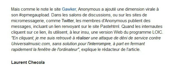 Accueil Geek Megaupload nouveau serveur et Anonymous ? Megaupload nouveau serveur et Anonymous ?zast·GeekScienceSecurité·23 janvier 2012 à 02h34 zast Suite à la fermeture de Megaupload et après avoir lu une quantité d’articles, je tenais à donner mon opinion mais surtout je vais comparer l’arrêt de Megaupload avec les BBS et les serveurs FTP. Puis je parlerai de ce qui s’est déroulé depuis la fermeture et enfin je parlerai de la liberté d’expression. Vous serez sûrement déçu car je ne vais pas donner des alternatives de Megaupload ni l’url du nouveau serveur de Megaupload (donc n’essayez surtout pas http://127.0.0.1 ;-)). Megaupload et les freewares ? Beaucoup de personnes s’étonnent et crient en voyant un site comme megaupload qui se ferme… A part un pourcentage très minime, il faut bien se rendre compte que cet hébergeur n’était pas là pour que vous puissiez télécharger vos images de distribution Linux ou des freewares. Il faut arrêter de se mettre un bandeau sur les yeux. Plus de la majorité des personnes l’utilisait à des fins illégales. Donc la fermeture de Megaupload est normale. Megaupload stockage de photos en ligne ? C’est vrai que quelques personnes (sans doute – de 2 %) ont utilisé ce service pour mettre leurs fichiers personnels (images de famille par exemple). En effet cette offre de stockage en ligne était sans comparaison au niveau du prix. Si vous alliez voir les concurrents de stockage en ligne il y a quelques années comme Dropbox, Mozy, CrashPlan, … les prix étaient exorbitants. Je parle de vrai stockage et non pas de concurrents comme Rapishare, Fileserve, … qui jouent dans la même cour que Megaupload pour les contenus (donc pas pour les distributions Linux). Personnellement, je pense qu’il faut avoir plutôt un accès Mozy, voir un serveur dédié ou un serveur Hubic (qui va sortir) plutôt que d’avoir une solution chez des sites comme Megaupload et ses amis.Donc pour revenir à ces quelques personnes qui auraient vraiment utilisé MegaUpload comme serveur de sauvegarde légal, je pense qu’il y aura sans doute un jour une infirme possibilité de retrouver un jour vos données … Megaupload, un BBS pirate ou un serveur 0 day ? On pourrait presque le comparer un BBS (bulletin board system) warez des années 80/90 ou vous trouviez des freewares et aussi des logiciels pirates. Souvent ces BBS pirates (qui se trouvaient dans le monde entier) vendaient des accès pour que vous puissiez télécharger. Ils étaient difficiles à trouver et les accès étaient donnés souvent qu’à une « élite ». Il y avait une organisation dans ces groupes avec les swappers, les coders, les crackers, …, avec des groupes mythiques comme Les Replicants, Razor 1911, … Puis soudain certains se faisaient buster (attraper) par la police … Et personne n’avait crié au scandale. Ensuite au début de l’ère d’Internet, vous pouviez trouver des serveurs FTP 0 day (voir 0 seconde) tenus par des teams qui vendaient (parfois) des accès pour que vous puissiez prendre des logiciels chez eux. Ils se trouvaient un peu partout dans le monde avec des bandes passantes ultra rapides. Encore une fois, il fallait faire parti de l’élite ou connaître les bonnes personnes pour pouvoir leecher ou être couriers. Beaucoup se sont fait arrêtés et encore une fois personne n’avait été étonné… La différence avec Megaupload par rapport à ces deux époques c’est que celui ci est accessible au plus grand nombre de personnes sans aucune connaissance. En effet, les moteurs de recherche vous permettaient de trouver facilement des contenus illicites. C’est devenu du piratage grand public et c’est fini avec le monde underground. Monsieur et madame tout le monde pouvaient (peuvent) accéder au contenu voulu… Le pire c’est que c’est la publicité qui faisait vivre ce site !Je pense vraiment que c’est pour cette raison que les gens s’offusquent principalement car on leur enlève ce qui était facilement piratable et surtout gratuit (ou payant). Personnellement je ne vois aucune différence entre ces époques. Cela a toujours été illégal… Dans le dernier cas le fondateur Kim Dotcom est devenu riche sur le dos des artistes et industriels. La police du monde entier se mettait déjà d’accord pour pouvoir attraper les différents membres dans les différents pays. Donc rien n’a changé… Depuis jeudi 19 janvier 2012 … Depuis jeudi, on a pu voir fleurir un site de phishing (109.236.83.xx) qui a été très diffusé (via le site reflets.info ? dont je ne comprends pas la démarche). Je pense que d’autres faux sites comme Megaupload vont apparaître afin de mettre des bannières de publicités et gagner de l’argent. Il y a aussi eu des attaques des Anonymous (via le logiciel Loic) sur plusieurs sites. D’ailleurs sur ces attaques, je suis surpris de lire dans un article du monde que les Anonymous ont forcé à leur insu des utilisateurs web à participer à ces attaques #opmegaupload. Si l’article de Laurent Checola est correct, je suis vraiment intrigué car je ne pensais pas que c’était la philosophie de ce groupe (surtout après avoir lu l’excellent Anonymous de Frédéric Bardeau et Nicolas Danet). Voici la liste des sites attaqués par les Anonymous : Department of Justice (Justice.gov)Motion Picture Association of America (MPAA.org)Universal Music (UniversalMusic.com)Belgian Anti-Piracy Federation (Anti-piracy.be/nl/)Recording Industry Association of America (RIAA.org)Federal Bureau of Investigation (FBI.gov)HADOPI law site (HADOPI.fr)U.S. Copyright Office (Copyright.gov)Universal Music France (UniversalMusic.fr)Senator Christopher Dodd (ChrisDodd.com)Vivendi France (Vivendi.fr)The White House (Whitehouse.gov)BMI (BMI.com)Warner Music Group (WMG.com) J’ajoute encore au moment où j’écris ces lignes http://somlivre.com/ & cbs.com (dimanche 22 janvier 2012 à 18h) De plus ce dimanche 22 janvier 