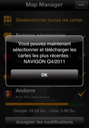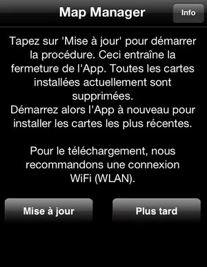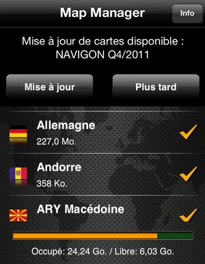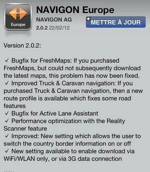 Accueil Logiciel Mise à jour de Navigon pour iphone Mise à jour de Navigon pour iphonezast·LogicielScienceVoitureVoyage·22 février 2012 à 19h33 zast L’application Navigon pour Iphone vient d’être mise à jour et la possibilité de télécharger les nouvelles cartes est enfin active ! Voici les nouveautés : – Correction du bug pour FreshMaps. Les abonnés peuvent maintenant télécharger leur première mise à jour de cartes – Optimisations pour l’assistant de voies actif et le reality Scanner – Info pays peut être éteint ou allumé navigation – Switch entre les téléchargements via le WIFI ou le 3 G – Amélioration du mode caravane et camion (Europe) – Optimisation de ma reconnaissance des numéros d’appartement (Amérique du Nord seulement) Je vous propose de voir comment télécharger les nouvelles cartes si vous avez acheté l’option FreshMaps pour Navigon sur Iphone Installer la mise à jour via l’apple store. Ensuite lancer Navigon. Vous aurez un message qui vous avertit qu’une nouvelle mise à jour des cartes FreshMaps est disponible. Une fois que vous aurez cliqué sur Map Manager, vous pourrez lancer la mise à jour. Attention elle ne commence pas tout de suite. Ensuite lorsque vous aurez cet écran (il faudra appuyer sur mise à jour), Navigon se fermera en effaçant toutes vos cartes.Voir aussizastLogiciel 23 septembre 2025 à 18h23Appsumo Bundle Volume 2 : AI Power Pack Il faut relancer Navigon pour iphone puis cliquer sur OK et accepter les modifications. Le chargement de toutes les cartes prendra du temps… Et à la fin vous aurez un petit message. Voilà c est fini, vous avez vos cartes pour Navigon à jour.