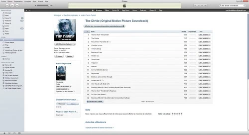 Accueil Film OST The Divide de Jean-Pierre Taïeb OST The Divide de Jean-Pierre Taïebzast·FilmMusique·3 juin 2012 à 15h45 zast En janvier 2012, j’avais eu l’occasion de voir le film The divide du réalisateur Xavier Gens au cinéma (disponible depuis le 1 juin 2012 en blu-ray et DVD). D’ailleurs j’avais fait l’interview de ce réalisateur. Ce qui m’avait marqué en regardant the Divide c’est la musique de ce long métrage qui a été composée par Jean-Pierre Taïeb. En effet, je l’avais trouvée superbe. L’OST (Original Sound Track) ou bande originale pour les francophones de The divide de Jean-Pierre Taïeb est disponible depuis aujourd’hui le 3 juin 2012 sur Amazon à 9.99 euros et Itunes à 8.99 euros (c’est là que j’ai effectué mon achat). Voir aussizastFilmGeek 29 juillet 2012 à 11h59Dimanche détente : The Expendables 2 Behind the Scenes Featurette Il y a 19 pistes qui sont très belles et décrivent bien le long métrage à l’univers apocalytique de The divide. Toutefois certaines musiques sont vraiment exceptionnelles comme la musique du thème de The divide (Theme from The Divide) , Running after my fate ou One way to life. Je suis devenu avec cet OST fan de Jean-Pierre Taïeb et je vous recommande vivement l’achat de cet album.