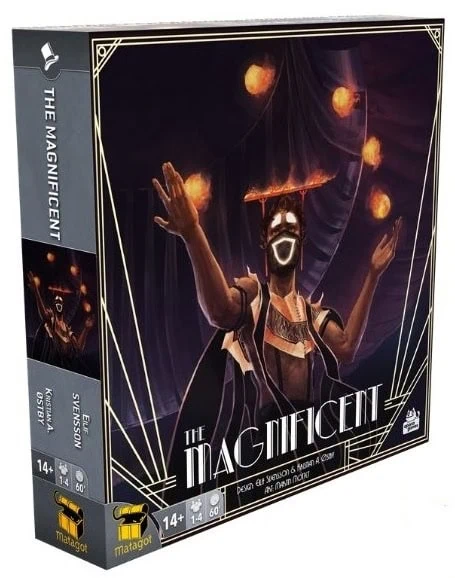 Accueil Jeux Test de The Magnificent Benjamin Guimbert Auteurs :Eilif Svensson, Kristian Amundsen ØstbyEditeurs :Aporta Games / MatagotNombre de joueurs / joueuses :1 à 4Thèmes :Dés, cartes, optimistion, Tetris, Magicien, Notre score90 Test de The Magnificent Eilif Svensson et Kristian Amundsen Østby chez Matagot The Magnificent est un jeu d’Eilif Svensson et Kristian Amundsen Østby, illustré par Martin Mottet. De 1 à 4 joueurs/joueuses à partir de 14 ans pour des parties de 60 à 90 minutes.Édité par Aporta Games, localisé par Matagot et distribué par Surfin’Meeple France. Disponible depuis juillet 2020. Synopsis : Dans ce jeu compétitif, en tant que Maître de Cérémonie d’un spectacle de Magie vous devez attirer un max de spectatrices/spectateurs en développant votre camp, des Talents, en montant des Spectacles avec les plus grands artistes afin de marquer le plus de points. En fin de partie, celle/celui avec le plus de points de Victoire remporte la partie. Mise en place : Après avoir placé le plateau au centre de votre surface de jeu et le séparateur en plastique qui contient la réserve de Pièces, Gemmes et tuiles Campement, lancez toutes et tous 1 dé pour déterminer le 1er joueur/la 1ère joueuse. Prenez ensuite les dés nécessaires pour votre partie (tous pour notre partie à 4) et place-les sur le Chapiteau Principal du plateau de jeu. Les 16 cartes Maitre de « départ » (numéroté de I à IV) sont mises de côté, mélangez les cartes restantes et placez-les sur l’emplacement prévu à cet effet en haut à gauche du plateau. Mélangez les tuiles Talent et posez-les face cachée à sur l’emplacement à côté des cartes Maître. Révélez maintenant les 3 premières cartes et tuiles pour une partie à 2 ou 3 joueurs/joueuses et 4 pour une partie à 4 joueuses/joueurs. Les Wagons sont placés sur leur case de départ (cercle blanc) de chaque Cercle Zone d’Itinérance. Placez aléatoirement un Chapiteau face visible sur chacune des cases avec le symbole affiche des 3 Cercles de la Zone d’Itinérance. Les cartes Affiche de départ (dos vert) sont mises de côté, mélangez les cartes restantes, placez-les face cachée sur l’emplacement correspondant à droite du plateau puis révélez-en 1 sur chaque emplacement du Présentoir des Affiches. Côté joueurs/joueuses : Prenez un plateau Joueuse/Joueur et placez-le sur la face A pour vos premières parties. Récupérez le matériel d’une même couleur. Le jeton suivi des scores est placé sur la case 0/100, 2 pions Chapeau dont un est posé sur la piste de Suivi des Représentations, la 1ère joueuse/le 1er joueur en première position (#1) puis dans l’ordre du tour, sens horaire. Pour votre première partie il est conseillé de prendre les cartes Maître du même numéro que votre plateau. Les cartes Affiche de départ (dos vert) sont mélangées puis distribuez-en 1 à chaque joueuse/joueur. L’Affiche de départ est placée au-dessus de votre plateau, du Chapiteau de départ (en haut à gauche), les cartes Maître face visible en dessous de votre plateau. Prenez ensuite 1 Gemme de chaque couleur à placer sur votre réserve, 6 Pièces et 1 pion Talent. La 1ère joueuse/1er joueur donne 1 pièce au dernier/à la dernière. En fonction du nombre de joueurs/joueuses révélez un certain nombre de tuiles Talent. A partir de la dernière joueuse/dernier joueur puis dans le sens antihoraire choisissez-en 1 que vous placez dans votre zone des Talents en bas à droite de votre plateau. A votre tour : La 1ère joueuse/1er joueur lance tous les dés, puis elle/il en choisit 1 qu’il/elle place sur une de ses cartes Maître ne contenant pas déjà un dé. Vous pouvez ensuite profiter du Bonus de cette carte (partie supérieur). Calculez ensuite votre Puissance en fonction de la valeur de chaque dé de la même couleur que vous avez pris aux tours précédents. Un dé transparent est associé à n’importe quel dé précédemment choisi. Il est également possible de défausser des Gemmes pour augmenter la Puissance : 1 Gemme = +2. Une Gemme transparente est un joker (n’importe quelle couleur). Effectuez ensuite une des 3 Actions suivantes : Construire Choisissez 1 niveau de construction inférieur ou égal à votre niveau de puissance. Prenez ensuite la/les tuiles Campement de la couleur du dé choisi (en plaçant un pion Talent sur l’emplacement correspondant du plateau vous pouvez ne pas tenir compte de la couleur de votre dé). La 1ère tuile construite est placée à n’importe quel endroit de votre Campement, les suivantes doivent être adjacentes à celle/s déjà posée/s sur votre plateau. Lorsque vous recouvrez une case bonus, récupérez immédiatement celui indiqué. Se déplacer Avancez le Wagon de la couleur du dé choisi du nombre de cases égal ou inférieur à la valeur de votre puissance, dans le sens horaire. Obtenez 1 Gemme ou 1 Affiche pour chaque case où vous passez et où vous vous arrêtez. Vous pouvez stocker 3 Gemmes max, prenez 1 Pièce par Gemme que vous ne pouvez pas stocker. Il faut arrêter votre déplacement sur la case où se trouve un jeton Chapiteau pour pouvoir récupérer ce dernier et le placer sur n’importe quel emplacement libre de votre zone des Chapiteaux. Si vous devez prendre 1 carte Affiche, piochez-en 1 ou prenez-en une face visible que vous ajoutez sur un emplacement vide au-dessus de votre plateau. Placez une nouvelle carte sur l’emplacement libre. Se Produire Placez votre pion Chapeau sur une case libre de la piste de Suivi des Représentations d’une valeur inférieure ou égale à votre Puissance. Si vous effectuez cette action pour la 2ème fois durant cette manche utilisez votre 2nd pion Chapeau. Résolvez ensuite autant d’Affiches que la valeur inscrite sur la case choisie. Pour cela l’Affiche doit avoir un Chapiteau en dessous, votre zone de Campement doit contenir au moins 1 fois les tuiles représentées sur la carte et s’i