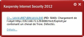 J’ai donc activé Java sur ces 2 machines. Ensuite j’ai essayé de me connecter sur mon serveur de test. Je dois avouer que Avast et Kaspersky ont bloqué l’exploit JAVA CVE-2012-4681 avec succès.