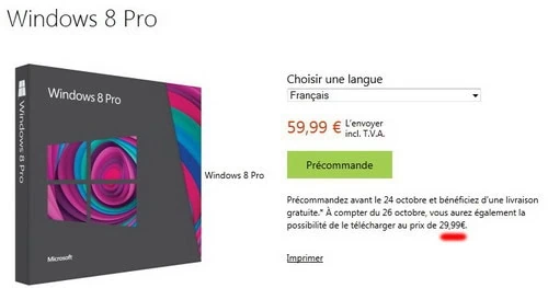 Accueil Bonnes affaires Windows 8 Pro à moins de 30 euros Windows 8 Pro à moins de 30 euroszast·Bonnes affairesLogiciel·20 octobre 2012 à 12h04 zast Si vous désirez faire la mise à jour vers Windows 8 pro, la précommande coute actuellement 59.99 euros (un peu moins sur les sites comme Amazon qui le propose à 53.90 euros). Personnellement je vous conseille d’attendre le 26 octobre 2012 car Microsoft proposera via son site, la mise à jour vers Windows 8 Pro en version de téléchargement à 29.99 euros ! Pour faire cette mise à jour, il faut être équipé de Windows XP SP3, Windows Vista ou Windows 7.Voir aussizastLogiciel 10 octobre 2021 à 19h15Antidote 10 v6.3 De plus, si vous possèdez actuellement Windows 7 Professionnel ou Intégral, Windows XP ou Windows Vista, il faudra réinstaller tous vos programmes (cela ne sera donc pas une simple mise à jour). Par contre, il ne devrait pas y avoir de problème avec les versions Windows 7 Édition Familiale Basique ou Familiale Premium.