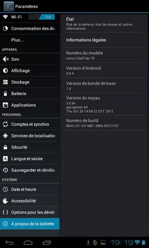 Accueil Critique Avis sur la tablette Android Lenco cooltab 70 Avis sur la tablette Android Lenco cooltab 70zast·CritiqueEnfantGeekHardwareLogiciel·13 mars 2013 à 20h35 zast Voici un petit avis et critique (review) sur la tablette Android Lenco cooltab 70. C’est une tablette bas de gamme (bon marché) sous Android 4.0.4 qui servira principalement pour vos enfants afin qu’ils puissent toucher à une première tablette car en effet elle n’est pas très rapide. L’écran est de 7 pouces (18 cm) et le son se trouve à l’arrière. D’ailleurs les enfants ont des difficultés à entendre quelques fois le son … :(. Il y a une protection autour de la tablette ce qui permettra d’éviter que vos enfants ne la cassent trop facilement. Au départ l’application Kido’z permet de protéger vos enfants de mauvais contenus. Personnellement, cette surcouche était assez ennuyante pour les enfants car elle utilise une partie des 512 mo de RAM. Donc la solution a été de couper le Wifi et de passer sans cette surcouche :). Lenco cooltab 70 permet de jouer à des jeux comme Angry birds (bizzarement des tablettes concurrentes n’arrivent pas) et surtout elle est compatible Google play ! Au niveau du processeur c’est un Allwinner A13, 1,2 GHz avec un processeur graphique Mali 400. De plus cette tablette arrive parfaitement à lire les vidéos de manière fluide. Il faudra ajouter un carte SD car les 4 go de mémoires ne sont pas suffisantes. Attention l’autonomie se situe vers 3 heures … Dans les mauvaises nouvelles, c’est qu’il n’y aura jamais de mise à jour en Android 4.1 (confirmation par le support technique). Pour les fans de benchmarks, cette tablette est à 3578 sous antutu benchmark 3.0.3. Pour le prix et pour l’utilité que nous en avons, nous en sommes contents. Par contre dès qu’il s’agit de jouer avec des jeux plus « costauds » mes enfants demandent à utiliser mon IPAD. Voici quelques images de cette tablette Voir aussiWolverineCritiqueJeux 2 novembre 2025 à 09h44Test et avis de Take Time chez Libellud Ajout du 12/01/2014 pour répondre à une question : Si vous êtes bloqué dans Kidoz (kido’z), il faut quitter l’application avant de choisir votre enfant en cliquant sur la croix. Je l’ai entouré en blanc pour l’explication. Il ne vous demandera pas de mot de passe Ajout du août 2014 : Vu la date de ce test, je vous conseille de regarder plutôt une tablette pour rapide…