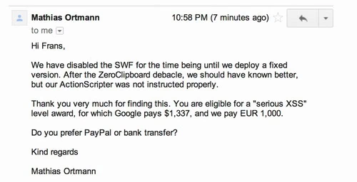 Accueil Actualite Une faille XSS dans Mega Une faille XSS dans Megazast·ActualiteGeekSecurité·10 février 2013 à 20h52 zast Beaucoup de personnes parlent de Mega de Kim Dotcom. Celui ci a déclaré que si un utilisateur trouvait une faille de sécurité, il lui donnerait de l’argent. Frans Rosén aurait découvert une faille de type XSS (cross-site scripting) et aurait été payé par Mega via Mathias Ortmann.Voir aussiWolverineGeek 20 septembre 2025 à 17h49GoPro Hero 14 Black et Max 2 pour le 23 Septembre Bien entendu Frans n’a pas dévoilé à l’heure actuelle sa faille de sécurité mais celui ci devrait être rectifié à l’heure où j’écris cet article.