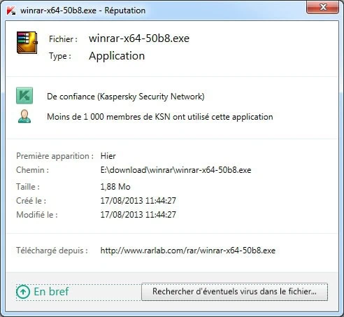 Accueil Critique Avis sur Kaspersky Internet security 2014 Avis sur Kaspersky Internet security 2014zast·CritiqueLogicielSecurité·17 août 2013 à 11h33 zast La nouvelle version de Kaspersky Internet security 2014 va être disponible (elle est déjà disponible dans certains pays). J’ai pu l’installer et voici mon avis rapide sur certaines nouvelles fonctionnalités de Kaspersky Internet security 2014 : La sandbox (lancement d’application dans un bulle sécurisé) n’est pas de retour malheureusement mais il y a une option pour vérifier les fichiers avant de les lancer. Il s’agit de Kaspersky application advisor . Je viens de la tester en téléchargeant la version béta officielle de Winrar. Donc en faisant un bouton droit j’obtiens ce menu : En cliquant dessus, vous arrivez sur une page web qui ira vérifier votre application : La vérification de la réputation des applications est disponible uniquement si vous avez accepté de participer au Kaspersky Security Network malheureusement :(. J’ai donc activer l’option pour la tester. J’utilise toujours mon fichier Winrar pour tester. Après avoir appuyeé sur Consulter la réputation dans le KSN, cet écran apparait et vous donne des informations sur le fichier. L’affichage avec plus de détails Et si vous cliquez sur rechercher d’éventuels virus dans le fichier… Au niveau rapidité, je n’ai pas trouvé que mon ordinateur était plus lent. L’installation (sans désinstaller l’ancienne version) a été très rapide et n’ a pas posé de problème. Kaspersky a reconnu tout de suite ma licence. Les menus sont simplifiés pour permettre à l’utilisateur de s’y retrouver plus vite. Le logiciel peut examiner vos programmes installés pour dire si vous pouvez avoir confiance : Voir aussi80%Benjamin GuimbertJeuxCritique 17 octobre 2025 à 10h41Test et avis de Woof Days et Cat Days Le rapport est beaucoup plus clair qu’avant et on a toutes les informations sur une même page. De plus cette nouvelle version de Kaspersky Internet security 2014 propose la prise en charge des dernières versions des navigateurs Internet populaires … (voir plus bas dans la liste des nouveautés) Mais on peut voir que ce n’est pas le cas avec mon firefox 23.0.1… En résumé, j’aime toujours bien Kaspersky Internet security 2014 car les anciennes versions m’ont toujours bien protégées. Par contre, il y a trop d’arguments commerciales inutiles et je trouve qu’ils ne sont plus à la pointe du progrès… Par contre leurs équipes s’activent toujours assez rapidement pour les recherches sur la sécurité et les mises à jour … Donc même si j’ai toujours un faible pour kaspersky (cela fait plusieurs années que je l’utilise), si je trouve une solution concurrente avec une option sandbox et que le couple antivirus/firewall fonctionne aussi bien que celui de kaspersky, il est possible que dans 200 jours, j’aille voir ailleurs … Voici les nouveautés : – Pour augmenter la sécurité d’utilisation des applications, le mode des Applications sécurisées a été ajouté. Quand le mode des Applications sécurisées est activé, Kaspersky Internet Security détermine automatiquement les applications sûres et autorise le lancement des applications sécurisées uniquement.– La fonctionnalité de la Protection bancaire a été améliorée : maintenant il est possible de sélectionner le navigateur Internet à ouvrir les sites des banques et des systèmes de paiement. La liste des sites Internet populaires est aussi complétée pour exécuter les opérations financières dans lesquels la Protection bancaire est activée automatiquement.– La fonctionnalité du Contrôle Parental est améliorée : la possibilité de configuration flexible des autorisations pour lancer les jeux et les applications est ajoutée. Les modèles préinstallés des paramètres du Contrôle Parental qui correspondent à l’âge des utilisateurs contrôlés sont ajoutés.– La configuration de Kaspersky Internet Security a été simplifiée. Maintenant, uniquement les paramètres de l’application utilisés plus souvent sont accessibles à la configuration.– La prise en charge des dernières versions des navigateurs Internet populaires est ajoutée : maintenant les modules de protection (par exemple, le module d’analyse des liens, la Protection bancaire) prennent en charge les navigateurs Internet Mozilla™ FireFox™ (versions 16.x, 17.x, 18.x, 19.x), Internet Explorer® (versions 8, 9, 10), Google Chrome™ (versions 22.x, 23.x, 24.x, 25.x, 26.x).– La fonction de protection contre les programmes malveillants de blocage de l’écran est ajoutée. Vous pouvez débloquer l’écran à l’aide de la combinaison de touches définie. La fonction de protection contre les programmes de blocage de l’écran détectera et neutralisera la menace.– L’efficacité de protection contre le phishing est augmentée : la fonctionnalité du module Anti-Phishing a été améliorée et actualisée.– La rapidité de l’application est augmentée et la consommation des ressources de l’ordinateur est optimisée.– Le mode d’activité limitée lors de l’inaction de l’ordinateur est ajouté. Maintenant pendant l’inaction de l’ordinateur, Kaspersky Internet Security consomme moins de ressources ce qui amène à l’économie de la consommation d’énergie lors de l’utilisation de la batterie.– Le temps de lancement de l’application est réduit considérablement.– La rapidité de l’interface graphique de l’application est augmentée et le temps de réaction sur l’action de l’utilisateur est réduit.– La présentation des rapports sur l’utilisation de l’application est améliorée. Maintenant, les rapports sont devenus plus simples et claires.– La possibilité de participer au programme « Protège ton ami » a été ajoutée. Vous pouvez maintenant partager le lien sur Kaspersky Internet Security avec les 
