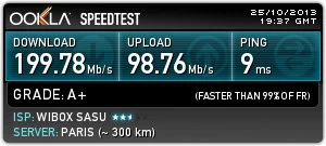 Accueil Geek Béta testeur de la fibre à 200 mb/s en test via Wibox Béta testeur de la fibre à 200 mb/s en test via Wiboxzast·GeekHardwareScience·25 octobre 2013 à 22h22 zast Comme vous le savez, je suis connecté en fibre (FTTH = fiber to the home). D’ailleurs j’avais publié un article sur mon FAI Wibox. Depuis aujourd’hui je fais parti des bêtas testeurs de la fibre à 200 mb/s en download et 100 mb/s en upload. Comme vous pouvez le voir, la vitesse est vraiment impressionnante 🙂 . Pour l’instant je n’en dirai pas plus car je vais poursuivre les tests…Voir aussiWolverineGeek 24 septembre 2025 à 08h00Les Glorieuses Guildes de Buttonville : Stratégie et Collection chez Ravensburger Sachez juste qu’un des ports est à 100 mb/s et en parallèle je suis à 200 mb/s. Donc je peux en branchant un PC sur chaque sortie faire 100 mb/s sur l’un et en même temps du 200 mb/s sur l’autre 🙂