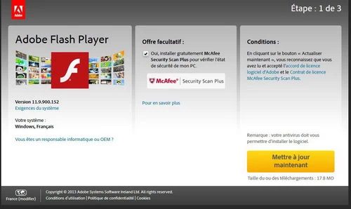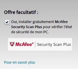 En effet, Adobe a un accord avec la société McAfee et par défaut lors de l’installation de la mise à jour de Flash player, vous aurez automatiquement de coché installation de McAfee sécurity Scan plus.