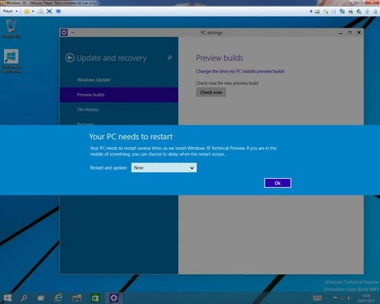 Accueil Logiciel Tuto : Comment mettre à jour windows 10 avec la nouvelle version 9926 Tuto : Comment mettre à jour windows 10 avec la nouvelle version 9926zast·Logicieltuto·24 janvier 2015 à 12h18 zast La nouvelle version de Windows 10 Technical Preview 9926 est disponible depuis hier. Par contre si vous avez déjà Windows 10 sur votre PC, Microsoft ne vous propose pas automatiquement la mise à jour car elle se fera au fur et à mesure. Voici comment forcer la mise à jour de Windows 10 en Windows 10 Technical Preview 9926. N’oubliez pas qu’il ne faut pas travailler avec une machine en production ou sur votre PC perso avec des versions techniques de Windows. Je vous conseille d’utiliser une machine virtuelle pour essayer les « technicals version » de Windows . Si vous allez dans les Windows update, vous verrez que cela ne fonctionne pas … Windows vous dira que votre version est à jour mais ce n’est pas le cas … Donc vous allez taper en bas de l’écran settings (là où il y a l’icône windows). Vous cliquez ensuite sur pc settings. Sur ce nouvel écran, vous choisissez Update and recovery. Vous cliquez sur Preview Builds puis Download now. Windows preview se télécharge. Le téléchargement est terminé. Cliquez sur Install now. La première partie de l’installation est en train de se faire 🙂 Maintenant vous devez relancer votre PC en cliquant sur OK L’installation se poursuit Encore un reboot (automatique) et l’installation se poursuit Encore un reboot automatique et elle continue Voir aussizastLogiciel 10 octobre 2021 à 19h15Antidote 10 v6.3 Voilà 🙂 C’est fait :). L’installation est terminée. Maintenant, pour vous connecter, pensez à changer la langue du clavier (en bas à droite sur ENG) Vous êtes maintenant sur Windows 10 Technical Preview 9926 Pour changer la langue de Windows 10 d’Anglais en Français, allez lire ce tuto 🙂 Tuto : Changer la langue de windows 10 (Anglais en Français par exemple) Je vous propose ce même tutorial en vidéo 🙂