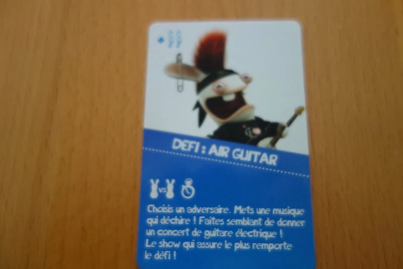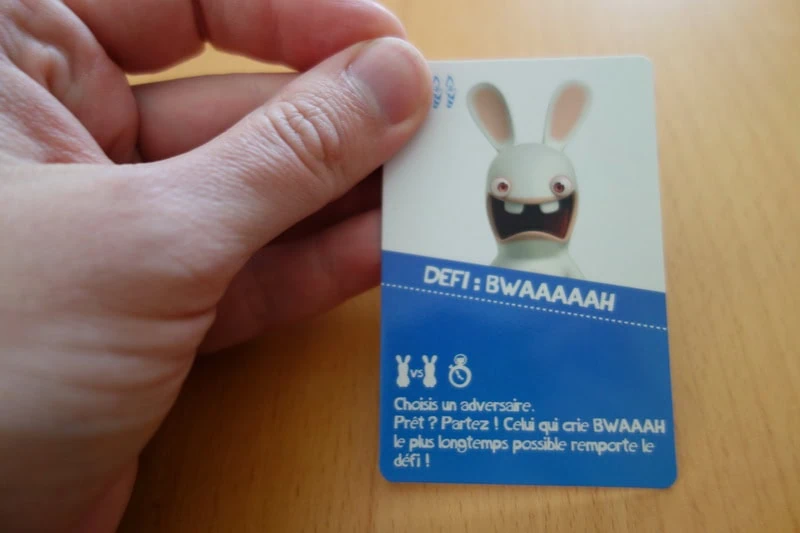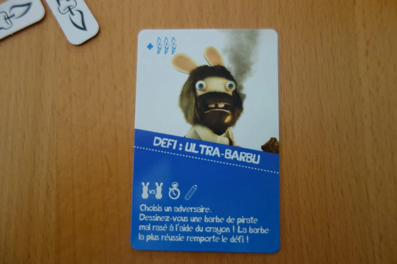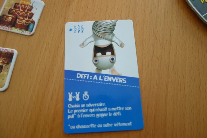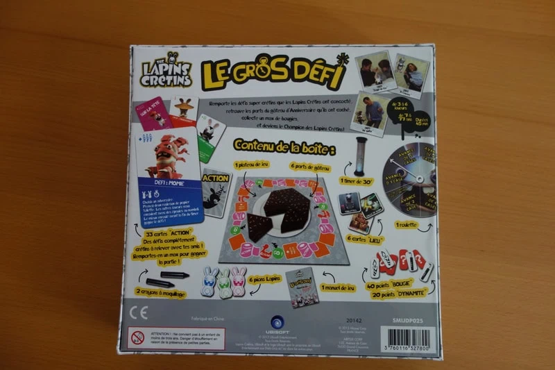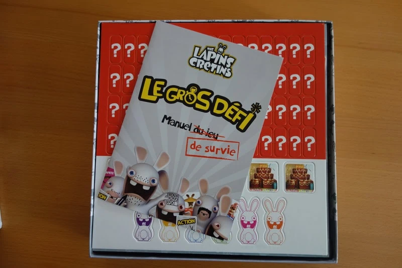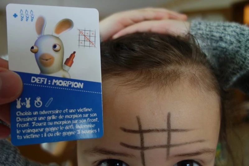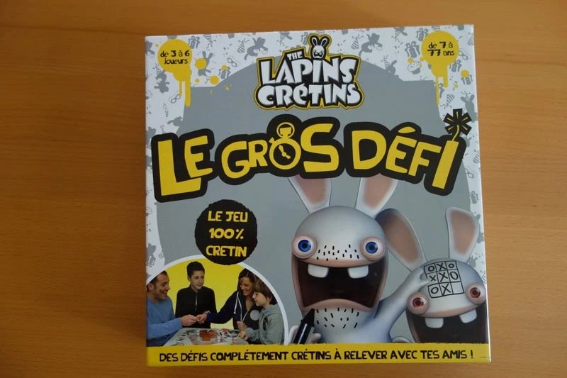Lapin crétin : le gros défi Accueil Critique Avis sur les Lapins Crétins : Le Gros Défi Avis sur les Lapins Crétins : Le Gros Défizast·CritiqueEnfantGeekJeux·3 avril 2015 à 16h03 zast Après les BD, le dessin animé, les jeux vidéo, les lapins crétins débarquent maintenant en ‘Bwaahte’ de jeu. C’est le 1er jeu de société totalement crétin qui a pour nom les Lapins Crétins : Le Gros Défi et qui est édité par Obyz. Pour passer une bonne soirée, les participants doivent être dans l’ambiance pour réaliser le Gros défi et surtout ne pas avoir honte d’avoir l’air complètement idiot. Comme le dit la citation, le ridicule ne tue pas. Et c’est vrai on a survécu ! Pour jouer il faut être de 3 à 6 joueurs et réaliser des défis. Le but est de récolter les parts du gâteau d’anniversaire et récolter le plus de bougies possibles. Nous avons testé le jeu à 3 puis à 4 joueurs. Dans le premier cas, nous étions 2 adultes et une enfant de 8 ans et lors de la seconde partie, nous étions 2 adultes, une enfant de 8 ans et un enfant de 4 ans et demi (qui a décidé de venir jouer après nous avoir vu rire). Le jeu convient donc à chaque âge même si il est conseillé à partir de 7 ans. Nous avons aussi fait une partie entre adultes. Les défis à réaliser sont complètement déjantés pour le plus grands plaisirs des enfants mais aussi des adultes qui ont envie de délirer un peu entre potes. Ainsi vous devrez sans doute réaliser le défi de la momie qui consiste à s’enrouler de papier toilette afin de devenir une véritable momie ou encore devenir un mono sourcil grâce au maquillage ou encore se dessiner une barbe de pirate mal rasé , ou encore mettre son pull à l’envers (d’ailleurs j’ai perdu sur cette épreuve de vitesse). Le défi du cowboy consiste à fabriquer une boulette en papier et la lancer le plus vite possible sur son adversaire. Vous jouerez sans doute également au jeu du morpion : jeu simple et connu de tous mais le but est de jouer contre un adversaire sur le front d’une victime en fabriquant une grille grâce au maquillage. Par exemple nous avons dessiné sur le front de ma fille 😉 Pleins d’autres épreuves sont bien entendu au rendez vous, comme faire du Air guitar, faire du karaoké en faisant des BWAAAH, faire du chifoumi, … Voir aussi80%Benjamin GuimbertCritiqueJeux 19 août 2025 à 14h38Test et avis de Ce Jeu est une Tuerie : Alien à bord Ces défis requièrent une grande agilité (en effet, pouvoir mettre son pull à l’envers ou tenir debout sur un pied n’est pas donné à tout le monde) et surtout un gros brin de folie. N’oublions pas qu’il faut aussi courir pour retrouver les parts de gâteaux cachés dans la maison ;). Avec ce jeu on retrouve tout à fait l’esprit des lapins crétins. A force de les regarder en BD ou en dessin animé on devient maintenant acteur ce qui permet d’assurer l’ambiance dans une soirée de folie. Comme vous vous en doutez les fous rires sont garantis et surtout on peut y jouer entre adultes (qui ont de l’humour) et surtout avec les enfants ! Voici encore quelques images : La boite du jeu lapins crétins le gros défi Il faut ramasser les dynamites le plus vite possible