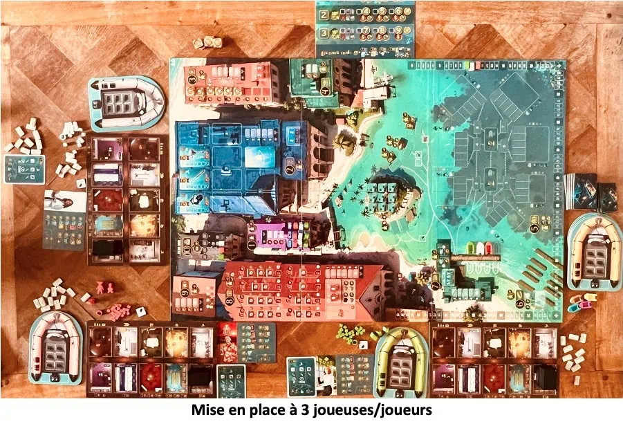 Accueil Jeux Test et avis de Thesauros Benjamin Guimbert Auteur :Cédric MilletEditeur :Super MeepleNombre de joueurs / joueuses :1 à 4Thèmes :Placement d’ouvriers, programmation/planification, gestion, développement, chasse aux trésors, plongée sous-marineNotre score85 Test et avis de Thesauros de Cédric Millet chez Super Meeple Thesauros est un jeu de Cédric Millet, illustré par Oscar Manuel et Yann Valeani. De 1 à 4 joueuses/joueurs à partir de 14 ans pour des parties de 30 minutes par joueur. Édité par Super Meeple, distribué par Néo Ludis. Disponible octobre depuis 2025. Synopsis Vous êtes à la tête d’une société de chasseurs d’épaves. Vous voilà prêt à partir à la recherche de trésors engloutis pour ensuite les vendre au musée pour en récupérer de l’argent et de la réputation. Développer des technologies, achat d’équipements, engager des ouvriers, les former, etc. Vous avez 3 ans, chacun découpé de 3 quadrimestres, pour faire vos preuves et marquer un maximum de points de réputation. Légère erreur sur la photo ci-dessous, chaque tuiles Détecteur de métaux doivent être placées dans le stock d’objets techno de votre plateau individuel. Comment jouer à Thesauros Une année comporte différentes phases : Phase de Revenus, Les investisseurs croient en vous. Recevez 50$ au début de la 1ère année, 30$ au début de la 2ème année + 5$/carte au trésor possédées. Au début de la 3ème année, recevez 10$ + 5$/carte au trésor possédées. Phase de Gestion des budgets, Répartissez votre argent dans les 5 catégories budgétaire possibles de la zone de compte de votre plateau individuel : . Compte Ressources Humaines, pièce violette,pour recruter des ouvriers. Il vous faudra les payer 2$ chacun à la fin de chaque quadrimestre. . Compte Recherche & Développement, pièce bleue, pour payer les frais des brevets technologiques et s’équiper avec les objets correspondants. . Compte Achats Généraux, pièce rouge, pour acheter des cartes aux trésors, louer des salles au musée, et financer votre publicité. . Compte Frais de Missions, pièce turquoise, pour financer vos expéditions en mer. . Caisse Noire, pièce noire, pour soudoyer les autorités locales afin de définir le prochain tour de jeu. S’il vous reste de l’argent au début de la prochaine année, vous pouvez le réaffecter à votre guise. Si vous devez payer mais que le compte utilisé ne contient pas suffisamment d’argent vous pouvez effectuer un transfert bancaire d’un autre de vos comptes. Ces transferts ont un coût qui diffère en fonction de l’année en cours : 1$ pour la première année, 2$ pour la suivante et 3$ pour la 3ème et dernière année. L’argent gagné durant la partie peut être réparti sur un ou plusieurs de vos comptes mais pas dans la caisse noire cela serait trop visible :-). Phases d’Actions, Programmation, dans l’ordre du tour de jeu, placez un de vos meeples, Boss ou ouvriers, qui se trouve dans le local de repos de votre plateau individuel, sur l’un des emplacements libres du plateau de jeu, le moins cher d’une file d’attente. Si vous avez unjeton Action double, alias un double expresso :-), et que vous l’utilisez, vous pouvez le placer sur l’emplacement choisi avant de mettre votre meeple par-dessus. Cela vous permettra de faire immédiatement une 2ème action dans la même zone. Il y a 9 zones où il est possible d’envoyer l’un de vos meeples, la 10ème ne pourra accueillir que votre jeton Dessous de table pour soudoyer les autorités locales. Il devra d’ailleurs être placé avant d’envoyer votre meeple dans l’une des 9 zones. Résolution, une fois tous vos meeples placés (1 boss + 2 ouvriers par joueur). Si vous ne voulez pas ou ne pouvez pas résoudre une action où vous avez envoyé l’un de vos meeples, perdez 1 point de Réputation. Résolvez chaque zone en commençant par la première puis suivez l’ordre croissant. Je vais en détailler quelques-unes : . Zone 1 : Recrutement Recrutez un nouvel ouvrier, le plus à gauche, en payant son coût depuis votre compte Ressources Humaines. Le coût dépend de l’emplacement où se trouve votre meeple dans la file d’attente. Si vous avez placé votre Boss, vous bénéficiez d’une réduction de 2$. L’ouvrier tout juste recruté est immédiatement placé sur un emplacement disponible du plateau de jeu hormis la zone 1, 5 et 10. En recrutant l’ouvrier du milieu vous récupérez également la tuile Action double. Cette tuile peut immédiatement être placée sous le meeple recruté, sinon placé là dans votre salle de repos du personnel. Pour l’ouvrier le plus à droite, gagnez 1 point de Réputation. . Zone 2 : Recherche et Développement Effectuez l’une des 4 actions suivantes : Développer le brevet d’une technologie disponible, placez un de vos cubes sur le côté gauche, correspondant au nombre de joueurs, de la carte Technologie choisie. Payez le coût du développement du brevet indiqué en haut de la carte. Acheter un objet technologique, celui-ci doit au préalable avoir été développé par vous ou un autre joueur. Si vous n’êtes pas le propriétaire du Brevet, payez les royalties au propriétaire en plus du coût de l’objet (indiqué en bas de la carte Technologie). Placez ensuite la tuile Objet technologique correspondante et placez-la sur votre plateau ou sur un emplacement libre d’un de vos zodiacs s’il est toujours à quai. Descendez le cube présent sur la carte d’un cran vers le bas. Développer un brevet et acheter le premier exemplaire de l’objet, même fonctionnement que 1) et 2) mais réuni en une seule action. Il vous faudra tout de même vous acquitter d’un coût plus élevé : coût du Brevet + coût de l’objet + coût des royalties. Se réserver de choisir la prochaine technologie, déplacez votre meeple de sa file d’attente sur le dessus du paquet de cartes Technologie. Cela permet, lors de la pha