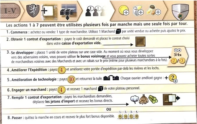 Accueil Jeux Test et avis de Clans of Caledonia Benjamin Guimbert Auteur :Juma Al-JouJouEditeur :Karma GamesNombre de joueurs / joueuses :1 à 4Thèmes :Eurogame, gestion, économie, stratégie, développement, expansion, placement d’ouvriers, majorité, Écosse, XIXème siècle Notre score90 Test et avis de Clans of Caledonia de Juma Al-JouJou chez Karma Games Clans of Caledonia est un jeu de Juma Al-JouJou, illustré par Klemens Franz. De 2 à 4 joueuses/joueurs à partir de 12 ans pour des parties de 30 à 120 minutes. Édité par Karma Games. Sorti en 2017 et disponible depuis novembre 2025 pour cette version big box. Par ici pour retrouver le jeu sur le site en ligne de l’éditeur : Clans of Caledonia: Industria (Expansion) Découvrons ici le jeu de base SommaireSynopsisComment jouer à Clans of CaledoniaFin de partieMon avis sur Clans of Caledonia Synopsis Faisons un saut dans le temps pour nous rendre au XIXème siècle en Écosse. Durant cette période, L’Écosse est passé d’une économie agricole à une économie industrielle notamment grâce au commerce et à l’exportation. Chacun, chacune de vous est à la tête d’un clan et allez devoir produire, commercer, vendre et exporter des produits agricoles et du Whisky. Vous avez 5 manches pour faire la différence. Comment jouer à Clans of Caledonia Pour chaque manche, suivez les 4 phases suivantes : Phase de Préparation Retournez face cachée la tuile de Score de la manche précédente. En fonction du nombre de joueurs, remplissez les cases du vide du plateau des exportations avec les contrats d’Exportation. Puis récupérez vos Marchands. Phase d’Action Dans l’ordre du tour, effectuez une action parmi les 8 possibles : Commerce Vous pouvez envoyer des marchands au Marché afin d’acheter ou vendre des marchandises d’un seul type, autant que le nombre de marchandises que vous souhaitez vendre ou acheter. Ils seront récupérés lors de la prochaine phase de Préparation. Achetez ou recevez le prix courant de la marchandise x le nombre. Ajustez ensuite le prix de la marchandise en baissant le marqueur de prix d’autant de crans que le nombre de marchandises échangées, vers le bas si vous avez vendu ou vers le haut si vous avez acheté. À noter, que vous ne pouvez pas avoir de Marchands sur la zone d’achat et de vente de la même marchandise. Obtenir un contrat d’Exportation Payez le coût en cours du contrat d’exportation sur le plateau correspondant et placez-le dans votre Caisse d’Exportation vide. Pour la première manche, vous percevez £5 au lieu de payer le coût. Et lors de la seconde, il sera gratuit. Pour les suivantes, ils seront payants. Votre caisse ne peut contenir qu’un seul contrat non rempli. Vous devrez donc le remplir avant de pouvoir en prendre un autre. Se développer Placez l’unité le plus haut placée dans la colonne correspondante de votre plateau : mouton, vache, fromagerie, boulangerie, champ, distillerie, bûcheron ou mineur, sur une case vide de la carte voisine ou à portée d’expédition de l’une de vos unités. Payez le coût indiqué dans la pièce entourée de rouge avec le chiffre rouge + le coût indiqué sur la case. En vous développant sur une case adjacente à une unité d’un autre joueur, vous pouvez immédiatement effectuer une action Commerce et acheter le type de marchandise produit par cette unité voisine, pas plus de 3. Le lait, la laine et les céréales sont réduits de £2, le pain, le fromage et le whisky sont réduits £3. Utilisez vos marchés et ajustez le prix comme vu précédemment. S’il y a d’autres voisins adjacents à votre case vous pouvez répéter cette opération. En plaçant votre 4eme bâtiment d’un type et que votre caisse d’exportation est vide, vous pouvez prendre 3 contrats d’exportation de la pioche, en garder un (en payant le coût) ou aucun et replacez les autres sous la pioche. Améliorer l’expédition Payez £4 pour avancer le marqueur d’expédition d’une case afin d’augmenter votre portée d’expédition. Vous pourrez ainsi vous développer à travers les rivières et les lochs. Vous ne pouvez jamais sauter par-dessus une case de terrain où le long d’une rivière. Améliorer une technologie Augmentez le revenu de vos ouvriers en améliorant leur équipement. Pour ce faire payez £10 et retournez la tuile Technologie correspondante. Ces ouvriers améliorés produiront dorénavant £2 de plus durant les phases de production. Engager un marchand Engagez un nouveau Marchand pour £4, placez-le de votre plateau vers votre stock. Remplir un contrat d’Exportation Vous devez en avoir un sur votre Caisse d’Exportation. Payez le coût indiqué, les marchandises dans la partie gauche de la tuile. Il se peut que vous ayez de la viande à fournir, en fonction il vous faudra abattre une vache et/ou un mouton que vous aurez préalablement placés sur le plateau de jeu. Replacez alors la figurine sur votre plateau. Vous recevez ensuite les avantages indiqués sur la partie droite. Lorsque c’est du coton, du tabac et/ou de la canne à sucre, avancez le/les marqueurs correspondants d’autant de cases que la valeur indiquée sur la piste d’Exportation. En atteignant ou dépassant une case avec 1 pièce, percevez £1. Placez ensuite votre tuile Contrat d’Exportation face visible à côté de votre Caisse d’Exportation. Passer SI vous ne souhaitez pas ou ne pouvez plus effectuer d’action, passez. Déplacez alors votre jeton d’ordre du tour sur la position libre la plus à gauche de la rangée inférieure et percevez le bonus en £ bas indiqué. Vous pouvez également effectuer une action gratuite, seulement si vous avez placé une de vos unités sur un hexagone adjacent, ou à portée d’expédition, à un Port. Dans ce cas, vous pouvez utiliser le bonus indiqué sur la tuile et placez un marqueur Bonus Port sur la tuile. Vous ne pouvez utiliser le bonus d’un port qu’une seule fois par parti