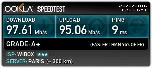 Accueil Geek Test wibox mois de mars 2016 Test wibox mois de mars 2016zast·Geek·28 février 2016 à 19h01 zast Si je peux et surtout si j’y pense, je vais essayer de faire une capture par mois pour mesurer la vitesse de transfert de mon provider wibox. Donc aujourd’hui je suis à 97.61 mb/s en download et 95.06 mb/s en upload avec un ping de 9 ms sur un serveur Orange à Paris.