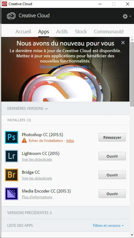 Accueil tuto Tuto Comment installer la dernière version de photoshop CC 2015.5 Tuto Comment installer la dernière version de photoshop CC 2015.5zast·tutoPhotographie·26 juin 2016 à 20h39 zast Si vous avez des difficultés à installer la dernière version de photoshop CC 2015.5 depuis le creative cloud voici une solution… En effet, après avoir essayé de nombreuses fois, j’obtenais toujours le message suivant : Exit Code: 146————————————– Summary ————————————–– 2 fatal error(s), 0 error(s), 1 warnings(s) FATAL: Error (Code = 146) executing in command ‘MoveDirectoryCommand’ for package: ‘AdobePreview1.2.0All-win64’, version:1.2.0FATAL: Error occurred in install of package (Name: AdobePreview1.2.0All-win64 Version: 1.2.0). Error code: ‘146’WARN: Failed to move directory ‘C:\adobeTemp\ETR638A.tmp\1\Application\preview.generate’ to ‘C:\Program Files\Common Files\Adobe\Plug-Ins\CC\Generator\preview20155.generate’————————————————————————————- Après ces tentatives, j’ai enfin trouvé la bonne solution … Il suffisait de désactiver temporairement mon antivirus Kaspersky. Il faut donc désactiver l’antivirus (ce que je n’apprécie pas). Puis il faut lancer l’installation de Photoshop CC 2015.5Voir aussizasttuto 28 septembre 2025 à 19h37Tuto Installation de Steam Link sur Amazon Fire TV Quand l’installation est terminée, vous pourrez ensuite réactiver kaspersky security suite. Photoshop sera enfin fonctionnelle :). Ajouter à l’Anti-bannière