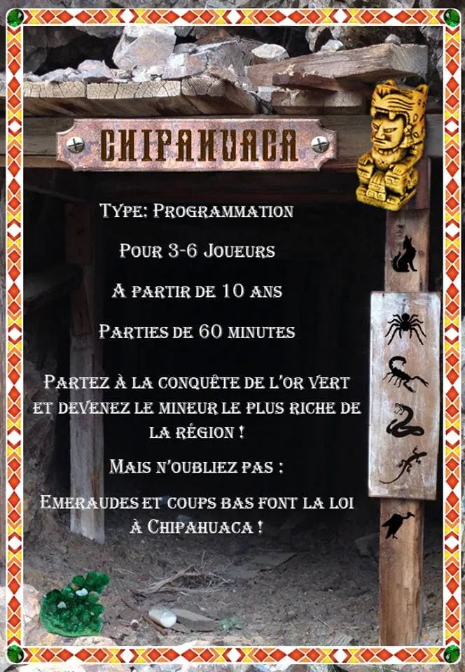 Accueil Jeux Découverte exclusive du jeu Chipahuaca d’Eric Jumel Découverte exclusive du jeu Chipahuaca d’Eric JumelWolverine·JeuxGeek·8 mai 2017 à 23h43 Wolverine Eric Jumel, créateur de plusieurs jeux de société (articles à venir prochainement) nous propose de découvrir aujourd’hui Chipahuaca, son tout dernier prototype. Pour l’occasion, nous l’avons rencontré le temps qu’il nous en parle et après, nous avons lancé une partie. Bien entendu, les règles vont encore évoluer en fonction des retours lors des parties sur les nombreux salons ou il va être présenté. Une chose est sûre, vous en entendrez reparler dans les mois à venir…..
