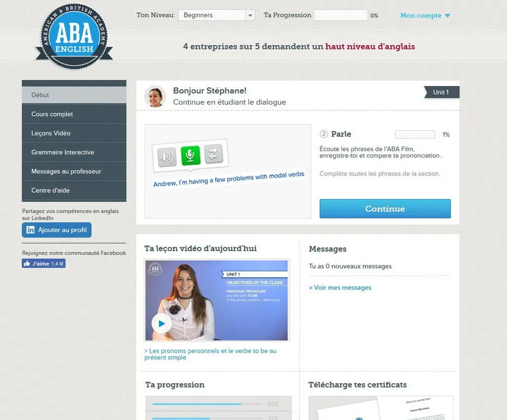 Accueil Critique Test de ABA English une manière intuitive d´apprendre l´anglais Test de ABA English une manière intuitive d´apprendre l´anglaiszast·CritiqueLogiciel·14 mai 2017 à 19h28 zast Voici notre test et avis sur ABA English qui permet d’apprendre de manière intuitive l’anglais. Nous l’avons testé sur une tablette (IPAD) et sur le web. Bien entendu, il est aussi possible de l’utiliser via un smartphone ou une tablette IOS ou Android. Que l’on soit débutant ou confirmé, l’application propose une solution à travers les 6 niveaux existants (Beginners, Lower-intermediate, Intermediate, Upper-intermediate, Advanced, Business). Personnellement, mon niveau actuel est B1. D’ailleurs à travers l’application, il est possible d’obtenir un véritable certificat. Pour rappel, les différents niveaux sont : NIVEAU BEGINNERS (A1) : pour ceux qui étudient l’anglais pour la première fois ou qui veulent recommencer en reprenant les bases NIVEAU LOWER-INTERMEDIATE (A2) : pour ceux qui possèdent déjà des bases en anglais, qui peuvent comprendre des textes courts et communiquer avec des phrases simples NIVEAU INTERMEDIATE (B1) : pour ceux qui possèdent déjà une certaine expérience en anglais et sont capables de décrire des situations et de s’exprimer avec un langage cohérent sur des questions qu’ils maîtrisent bien. NIVEAU UPPER-INTERMEDIATE (B2) : pour ceux qui sont capables de comprendre les points clefs de textes complexes de manière autonome et peuvent s’exprimer de manière spontanée et improvisée NIVEAU ADVANCED (B2-C1) : pour ceux qui peuvent comprendre des textes complexes et communiquer avec fluidité avec des natifs NIVEAU BUSINESS (C1) : pour ceux qui disposent déjà d’un niveau Advanced et veulent approfondir l’anglais dans le cadre du travail Tout d’abord, l’application est facile à comprendre et les menus ne sont pas déroutants. La démarche utilisée est basée sur l’écoute via des courts-métrages puis nous apprenons à parler avant d’écrire et de maîtriser la grammaire. C’est un peu à l’image d’un enfant qui écoute puis qui apprend à parler. Je trouve cette méthode très intéressante. En effet, j’ai essayé différentes méthodes, dont des cours avec un professeur que je prends avec des collègues une fois par semaine. Je dois dire que je progresse petit à petit. C’est pour cela qu’ABA English m’intéressait, car c’est cette manière ludique que j’ai apprécie. Pour les courts-métrages (144 sur l’application), les vidéos sont d’un niveau excellent. En effet, les acteurs donnent une touche réaliste. Pour une fois, je dois avouer que je n’ai pas eu envie de « zapper » après la première vidéo. Après avoir regardé le court-métrage, on entre dans la partie intitulée PARLE. On doit enregistrer sa voix de manière et on compare sa prononciation par rapport à l’acteur ou à l’actrice. Ensuite, la partie ECRIS, permet d’écrire les phrases du dialogue à la manière d’une dictée. Pour la partie INTERPRETE, on joue le rôle d’un des personnages. La partie Leçon VIDEO permet d’apprendre en vidéo la grammaire. La partie exercices permet de faire des exercices écrits en remplissant des cases vides. Et le vocabulaire permet de connaître un peu plus de mots. L’avantage c’est qu’on entend le mot et que l’on enregistre sa voix pour vérifier que l’on prononce de la bonne manière. On peut aussi y accéder en version web ABA English propose une formule gratuite, mais limitée. Sinon il faudra se tourner vers la solution payante pour accéder l’ensemble des outils et des services. L’offre gratuite permet :Voir aussizastCritiqueEnfantHardware 26 septembre 2015 à 09h12Avis sur la tablette Kids Tablet – 144 leçons vidéo avec toute la grammaire anglaise expliquée par les professeurs – Un encadrement par un professeur assigné – Un accès à la grammaire interactive et aux outils d’analyse et de suivi de la progression – Un test de la première unité de chaque niveau, avec l’ABA Film et les exercices correspondants La formule payante : – Accès aux enseignements complets : ABA Films, leçons vidéo et exercices dans les 6 niveaux durant la période souscrite – Un encadrement par un professeur assigné qui peut être consulté sans limite – Possibilité de travailler sur tous les niveaux et de finaliser l’enseignement complet. Flexibilité complète pour avancer, revenir en arrière ou refaire n’importe quel niveau ou unité – Obtention de certificats En résumé, à l’heure actuelle, je trouve que cette solution est performante pour améliorer son niveau d’anglais. Le site officiel : http://www.abaenglish.com/fr/ L’application Android : https://play.google.com/store/apps/details?id=com.abaenglish.videoclass L’application IOS : https://itunes.apple.com/us/app/learn-english-with-films-aba-english/id859243872?mt=8 J’ai aussi réalisé un test de l’application en vidéo :