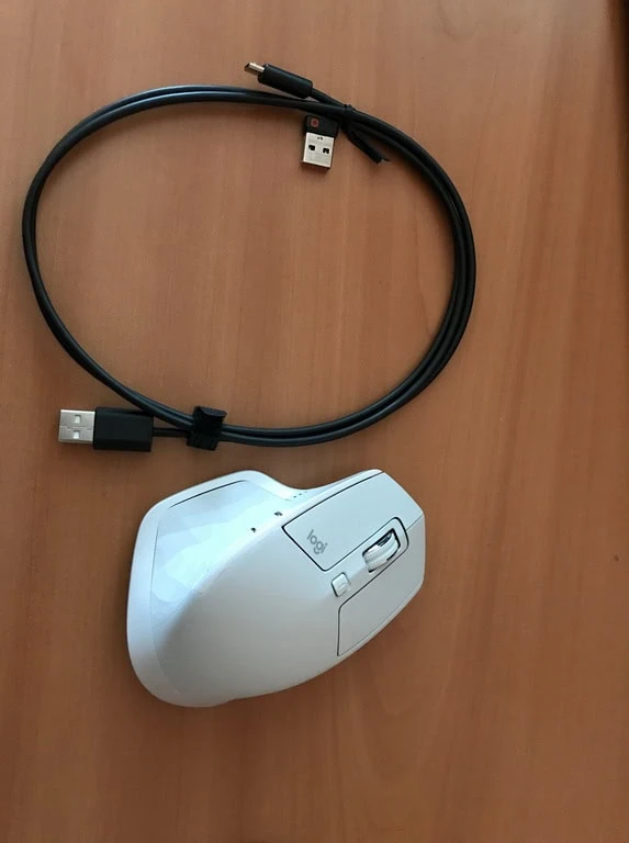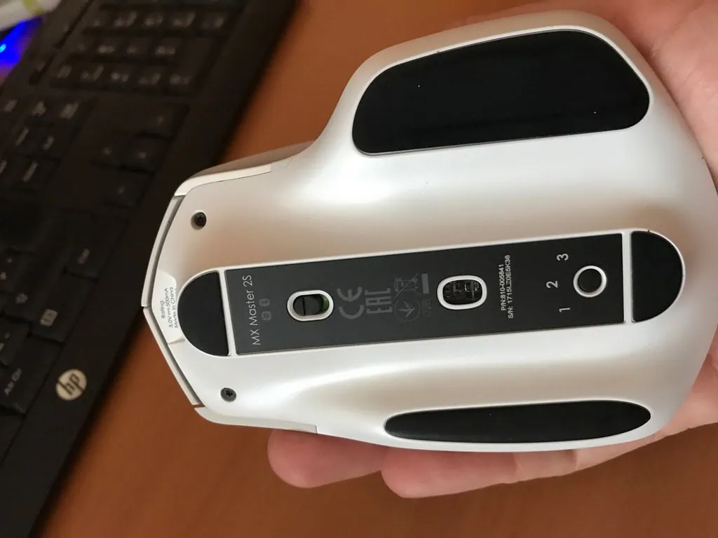 La souris possède une batterie interne. Le câble de chargement est fourni. Il suffit de 3 minutes pour recharger la souris pour une journée. Sinon si on la charge complètement on peut l’utiliser presque pendant 70 jours. On peut voir en dessous un sélecteur 1-2-3 pour choisir avec quel ordinateur on peut synchroniser la souris.