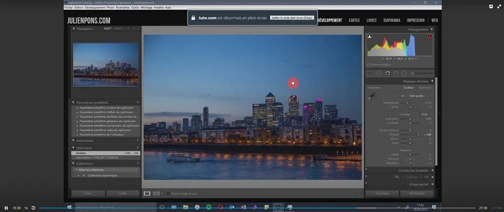 Accueil tuto Tuto : Masterclass Lightroom – Etalonner, maîtriser lumière et couleur Tuto : Masterclass Lightroom – Etalonner, maîtriser lumière et couleurzast·tuto·4 juillet 2017 à 19h50 zast Nous vous proposons de découvrir une nouvelle formation avec notre partenaire Tuto.com. Cette fois, c’est le tuto Masterclass Lightroom – Etalonner, maîtriser lumière et couleur de Julien Pons. Julien donne beaucoup d’exemples pratiques afin de comprendre les différents réglages à utiliser. Qui peut suivre cette formation ? Ce tutoriel Lightroom est destiné aux personnes qui débutent sur le logiciel où pour celles qui souhaitent élargir leurs connaissances en retouche photo au format RAW. Il vous permettra d’apprendre les bases indispensables de la lumière et de la couleur dans la photographie en général (RVB, CMJN, LAB, roue chromatique, etc …). Le programme qui vous attend Aux côtés de Julien Pons, 2h30 de cours en vidéo vous attendent et voici les thématiques qui seront abordées : l’exposition les réglages de lumière depuis l’histogramme la courbe les outils Teinte / Saturation / Luminance le filtre Gradué le filtre Radial la correction optiques la création de noir et blanc l’export Voir aussizasttuto 28 septembre 2025 à 19h37Tuto Installation de Steam Link sur Amazon Fire TV Tout au long de cours en vidéo, de nombreuses astuces et raccourcis vous seront dévoilés pour optimiser votre workflow. Sachez que tous les fichiers sources sont fournis dans ce tutoriel afin que vous puissiez vous entraîner sur les mêmes exemples que ceux vus en cours. Également, si vous êtes bloqué où si vous avez des questions, un salon d’entraide est disponible où vous pourrez échanger avec le formateur et les autres apprenants. A présent, voici un tutoriel offert par Tuto.com et dédié au panneau TSL de Lightroom. https://paradoxetemporel.fr/wp-content/uploads/2017/07/85021-368891.mp4
