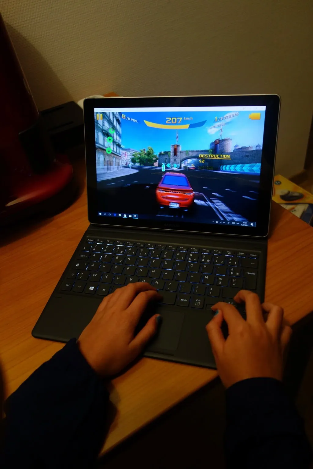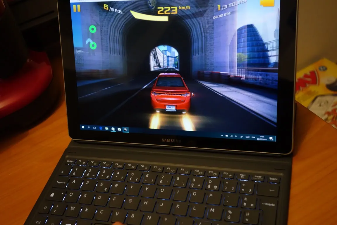 Accueil Hardware Test du Samsung Galaxy book 12 pouces Test du Samsung Galaxy book 12 pouceszast·HardwareCritiqueGeek·28 juillet 2017 à 12h12 zast Voici mon avis et test sur le Samsung Galaxy book 12 » (12 pouces) qui fait à la fois office de tablette et d’ordinateur. En effet, il tourne sous Windows 10 64 bits et dispose d’une puissance de traitement assez incroyable pour sa taille et son poids. Niveau technique : Au niveau des spécifications techniques, Il est équipé d’un processeur Intel i5-7200U à 3.1GHz. Ce n’est pas exactement la vitesse en réalité c’est un CPU à 2,5Ghz et le turbo monte à 3,1Ghz. Donc lorsque le processeur dual core est en attente, on reste à 2,5ghz Au niveau de la mémoire, on retrouve 4 Go ainsi qu’un disque de 128 Go (disque LITEON CV3-8D128). Pour la partie graphique, c’est une carte graphique intel HD 620. L’écran est magnifique en utilisant la technologie super AMOLED et restituant une résolution de 2160 x 1440. Pour la partie connectique, on a du wifi 2.4 GHz et 5 GHz, du bluetooth 4.1, 2 port USB C 3.1, un slot micro SD, une prise jack. Le slot micro Sd se trouve de côté. Pour la partie photo et vidéo, on a du 13 millions de pixels à l’arrière et 5 millions de pixels à l’avant. J’en reparlerai par la suite. Ce Samsung Galaxy book est vraiment fin 7,4 mm et il est aussi léger 754g. Au niveau de la taille, les dimensions sont 199.8 x 291.3 x 7.4mm Un étui clavier est fourni avec le Samsung. Le clavier est très fin et rétro éclairé. La tablette s‘adapte très bien. La partie du pavé tactile me fait penser à un MacBook, car celle-ci répond bien. Par contre, le poids passe à 1159 g, On retrouve aussi un stylet dont je reparlerai plus tard. Installation : Lors de la première utilisation, il faudra configurer les paramètres de Windows 10 en anglais. Il ne faudra donc pas oublier de bien choisir la langue française, le clavier français. Je vous conseille aussi de ne pas utiliser les paramètres par défaut de Windows et de choisir de ne pas renvoyer les données à Microsoft (c’est un choix personnel). Une fois installé Windows, le Samsung vous demandera de faire la mise à jour de Windows 10. Il faudra donc prévoir encore quelque temps pour télécharger cette mise à jour et ensuite pour que l’installation s’effectue. Utilisation : Une fois Windows 10 installé et sans avoir ajouté une carte microSD pour ajouter de la taille disque, il reste environ 106 go en sachant qu’on retrouve un répertoire windows.old que l’on pourra sans doute supprimer. Au niveau de la machine, j’ai utilisé le logiciel passmark pour faire mon benchmark. Le résultat global est de 2399,2. Pour le processeur uniquement le score monte à 4695 ce qui le place juste en dessous d’un Intel Core i7-2630QM. Le lien vers mon test si vous désirez consulter mes informations sur le site passmark : https://www.passmark.com/baselines/V9/display.php?id=86518953896 J’ai d’ailleurs réussi à faire chauffer les processeurs à 59 degrés. On ressent une légère chaleur sur la tablette lorsque vous l’utilisez au maximum de ses possibilités. En effet, c’est à ce moment que le processeur passe de 2,5 GHz à 3,1 GHz. Voici d’ailleurs les informations plus techniques sur la configuration : On peut lire sans problème des vidéos en 4K sur youtube. L’écran est d’ailleurs superbe et les noirs profonds. C’est des meilleurs écrans que j’ai eu l’occasion de voir. Je n’ai pas de limite sur ce point. Par contre l’écran n’est pas en vrai 4K. On peut aussi bien entendu surfer sans aucun problème. Pour une utilisation de jeux vidéo, je n’ai pas eu de difficulté. On peut utiliser par exemple le Windows store et j’ai joué à Asphalt 8 : Airborne sans problème. Les commandes répondaient bien et la fluidité était parfaite. Pour la partie du stylet, par défaut il y a déjà des applications installées. On peut donc écrire des notes ou encore dessiner. Lorsque l’on écrit, l’écran répond bien et je n’ai pas noté de décalage. Pour la partie dessin avec le logiciel Sketch, c’est impeccable. On peut facilement dessiner de manière correcte et on n’a pas de sentiment de lag. C’est précis et parfait. Voir aussi90%Benjamin GuimbertCritiqueJeux 15 septembre 2025 à 10h22Présentation de La Mission Disparue-Les Ruines Perdues de Narak Pour la partie photo, la qualité en intérieur pour la capteur avant est très bonne malgré le capteur qui se limite à 5 MP avec un rapport de f/2.2 en 64 iso par exemple et pour le capteur arrière j’étais à f/1.9 en 50 ISO. Autant dire que c’était très bon.Pour l’extérieur, le capteur arrière est excellent et le capteur avant ne m’a pas déçu. N’oublions pas que les tablettes ne sont pas destinées en principe à faire de la photo :). Voici les tests de photos (en cliquant dessus vous pourrez voir les images qui ne sont pas redimensionnées) Capteur avant en intérieur Capteur arrière en intérieur Capteur avant en extérieur Capteur arrière en extérieur Conclusion : En conclusion, je n’ai rien noté de vraiment négatif. Il y a l’espace disque, mais vous pouvez soit prendre la version supérieure du Galaxy book 12 » soit ajouter une carte micro sd de 256 go pour compenser. On peut y ajouter une clé usb c sans problème. La mémoire est peut être un peu juste pour certaine utilisation, mais n’oublions que nous sommes sur une machine qui ne fait que 7,4 mm ! C’est un sérieux concurrent aux machines sous IOS ou Android voir à MacOs car ce Galaxy book est performant sur tous les niveaux. Je possède en effet, un macbook pro, des ipad et des tablettes Android qui m’ont permis de pouvoir comparer. Samsung a réussi à concurrencer par le poids et la performance, les autres concurrents. Mon test en vidéo du Samsung Galaxy book 12 pouces : [amazon_link asins=’B072C27BXC,B071J157NY,B0719P8CYY’ template=’ProductCarousel’ st