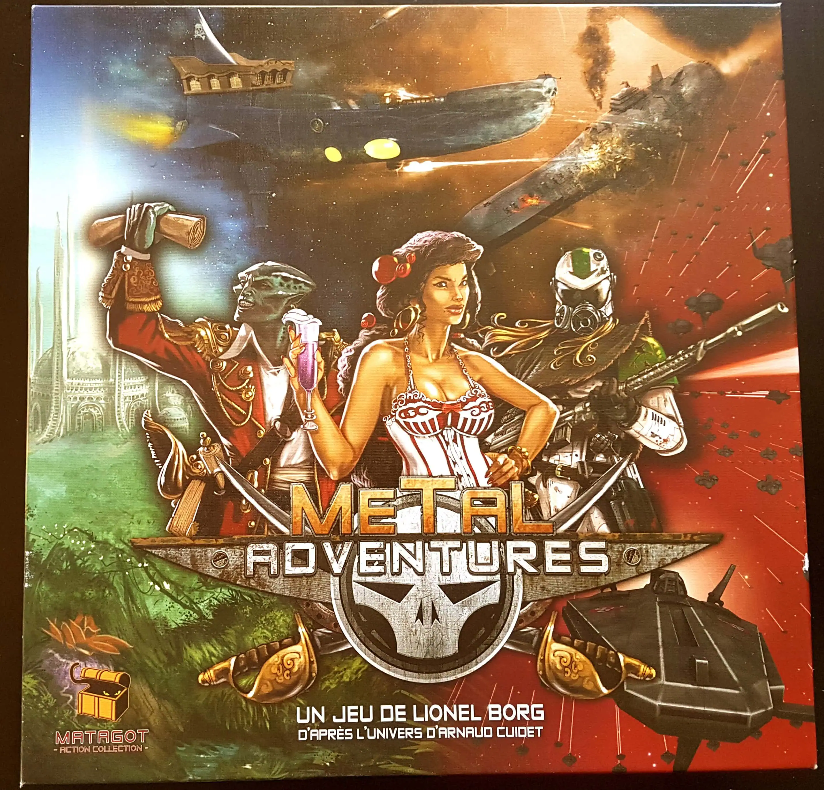 Accueil Jeux Test de Métal Adventures, le space opéra vu par Matagot Test de Métal Adventures, le space opéra vu par MatagotBenjamin Guimbert·Jeux·5 décembre 2017 à 22h03 Benjamin Guimbert Métal Adventures chez Matagot Métal Adventures est un jeu de Lionel Borg, illustré par Camille Durand-Kriegel, Jonathan Hartert, Remton, Dimitri Bielak et Ervin. Edité par Matagot. De 3 à 6 joueurs, à partir de 14 ans et plus (comme écrit sur la boite, mais il est possible d’y jouer plus jeune 🙂 ), pour des parties de 45-60 minutes voir un peu plus. Sorti en mars 2015. Le jeu est tiré de l’univers du jeu de rôle Métal Adventures d’Arnaud Cuidet. Chaque joueur sera aux commandes d’un vaisseau pirate et l’objectif sera de combattre les autres vaisseaux : Solaire, Impérial, Barrens, OCG, ainsi que les chasseurs de pirates, les joueurs adverses et les planètes pour gagner des points de Gloire. Set up de départ par joueur : Une carte vaisseau, 3 crédits galactiques, un dé Métal Faktor placé sur sa face vide, 3 cartes trophées (soit des objectifs) en garder 2 et la dernière retourne sous la pioche à trophées, et un magnifique Astrolabe (Cf ; photos ci-dessous) L’objectif des joueurs de Métal Adventures sera d’atteindre le maximum de points de Gloire. A partir de 9 points, la partie est gagnée et le jeu prend fin. La deuxième condition de fin de partie aura lieu lorsqu’il ne restera que 2 cartes ou moins dans la pioche de l’espace. Au menu, nous avons donc la fraternité des pirates, phase obligatoire si l’on se ne repose pas. Le joueur va payer 1 crédit galactique à la fraternité puis effectuer le combat et la tournée des pirates dans l’ordre de son choix. Lors d’un combat, le joueur va jeter le dé orange et le dé gris. Le premier s’additionnant à la puissance de son vaisseau et le second au vaisseau attaqué. En cas de défaite du joueur, le nombre de dommage reçu est noté sur la carte du vaisseau attaqué. Avant ou après le combat le joueur peut, si il le souhaite, effectuer la tournée des pirates. La tournée démarre à Exxalia pour se terminer à Karokum. Le pirate va pouvoir effectuer autant d’actions qu’il le souhaite parmi les 10 disponibles sur les différentes planètes. Mais attention pas de marche arrière sur les vaisseaux galactiques. Enfin comme tout bon pirate qui ne se respecte pas (humour), il y a le repos sur Havana, planète des pirates. C’est gratuit mais on s’ennuie. Cette action permet de remonter la pente : réparer tous les dégâts de son vaisseau, prendre 2 crédits galactiques, le dé Métal Faktor est remis à zéro. Le joueur peut, si il le souhaite, remettre une des ces cartes trophées sous la pile des trophées, en piocher deux et en garder une, un classique. Et une amélioration peut être achetée au comptoir OCG pour 1 crédit galactique de plus que son coût. Justement, parlons des cartes améliorations : 4 types d’améliorations (cf photo ci-dessus). De gauche à droite : le soutien, l’outil, l’armure et l’arme. Le coût de l’amélioration est inscrit en haut à droite de la carte. Possibilité de chainage, de combos, d’améliorer la puissance de son vaisseau, etc. Cartes vaisseaux La pioche de l’espace est constituée de cartes vaisseau au dos bleu et au dos rouge. Vous l’aurez certainement devinés, les combats vont se corser une fois dans le rouge et les vaisseaux chasseurs de pirates vont débarquer. Ils resteront en jeu tant qu’ils ne seront pas détruits. De plus, des cartes événements sont placées aléatoirement dans cette pioche. Elles viennent rajouter un peu de piment galactique dans le déroulement du jeu. Et très souvent, ça pique !!!Voir aussiWolverineJeux 19 septembre 2025 à 09h56Snorkeling chez Haumea Games, un petit jeu à petit prix en financement Le jeu devient très interactif lorsque l’un des pirates va demander de l’aide à un autre de ces comparses (un autre joueur) afin de s’allier à lui pour combattre n’importe quel vaisseau ou une planète. Généralement du à la puissance supérieure de la cible. Une phase de négociation démarre entre l’attaquant et son (ses) futur(s) allié(s). Une fois la négociation terminée, et dans le cas où un joueur décide de s’allier à l’attaquant celui-ci pourra décider de rompre son arrangement. Juste avant de jeter les dés de combat, le joueur allié pourra décider de trahir le joueur attaquant en s’alliant avec le vaisseau ou la planète attaqués. AMBIANCE garantie !!! Et selon le code de l’honneur et éthique des pirates (oui, oui, il existe…), chaque trahison ou chaque promesse non tenue entrainera une décision irrévocable du jugement des pirates. Le joueur devra positionner la molette correspondante sur son astrolabe sur 1 ce qui lui fera perdre d’office un point de Gloire. N’oubliez pas tout est négociable mise à part les points de Gloire. Et oui, Pas de trahison sans gloire, heu non pas de gloire sans trahison, heu non plus, enfin vous m’avez compris comme dirait l’autre. Un deuxième attrait important du jeu est ce fameux dé Métal Faktor. Lors d’un combat un joueur pourra décider d’utiliser son dé Métal Faktor. Celui-ci lui apportera un bonus lors de son attaque. Le résultat sera additionné à la somme de son dé de combat et à sa puissance. Super bonus me direz vous, et bien oui et non. Une fois utilisé, l’effet du dé Métal Faktor s’inverse. Lors du prochain combat, il faudra soustraire ce résultat à la puissance de son vaisseau. Dé Métal Faktor Métal Adventures est un très bon jeu de combats galactiques, de négociation, de trahison et de possibilité d’améliorations. Le thème est bien présent dans ce jeu atypique de chez Matagot. Il se peut que des parties se déroulent sans aucune trahison voir même sans négociation… Mais alors, est ce de la piraterie ? ?? Article de Benjamin Guimbert