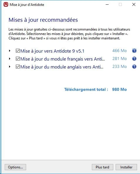 Accueil Logiciel Mise à jour vers Antidote 9 v5.1 Mise à jour vers Antidote 9 v5.1zast·Logiciel·17 décembre 2017 à 19h51 zast Une nouvelle mise à jour gratuite du logiciel de correction Antidote 9 v5.1 vient d’arriver. Les modules impactés : Le connecteur, le module français et le module anglais si vous avez aussi pris cette option. Mise à jour de connecteurs no 8 pour Antidote 9 v5.1 Intégration à Firefox 57 Intégration à Google Chrome 62 Intégration à Illustrator 2018 (22.0) Intégration à InCopy 2018 (13.0) Intégration à InDesign 2018 (13.0) MS Outlook 2013 et 2016 – Erreur 5153 moins fréquente en mode de réponse incorporée Voir aussizastLogiciel 23 septembre 2025 à 18h23Appsumo Bundle Volume 2 : AI Power Pack Version Antidote 9 v5.1 Général Anti-Oups! – Élimination de messages d’erreur inopportuns Meilleure stabilité Correction d’anomalies diverses Nouvelles intégrations JS-Connect – (pour les développeurs) API d’intégration des boutons d’Antidote directement dans les pages Web Intégration à Firefox 55 Intégration à Google Chrome 60 Intégrations améliorées LibreOffice, MS Word – Élimination de messages d’erreur inopportuns Thunderbird – Conservation de la sélection après une synchronisation [amazon_link asins=’2922010228,B016U9NMZY’ template=’ProductCarousel’ store=’dvdalliance-21′ marketplace=’FR’ link_id=’5b4fb97e-e35b-11e7-a3b1-65d8e1c86f0f’]